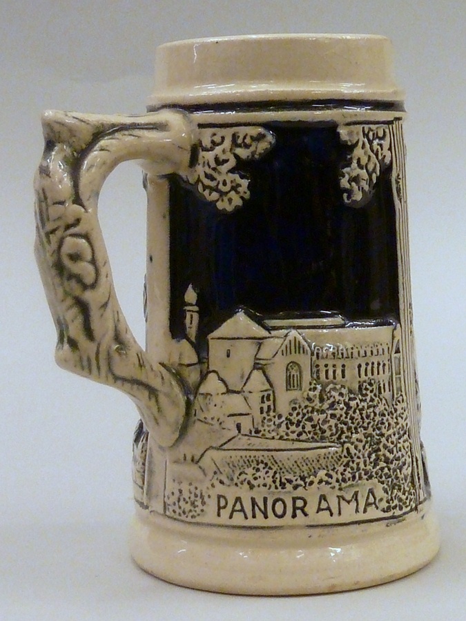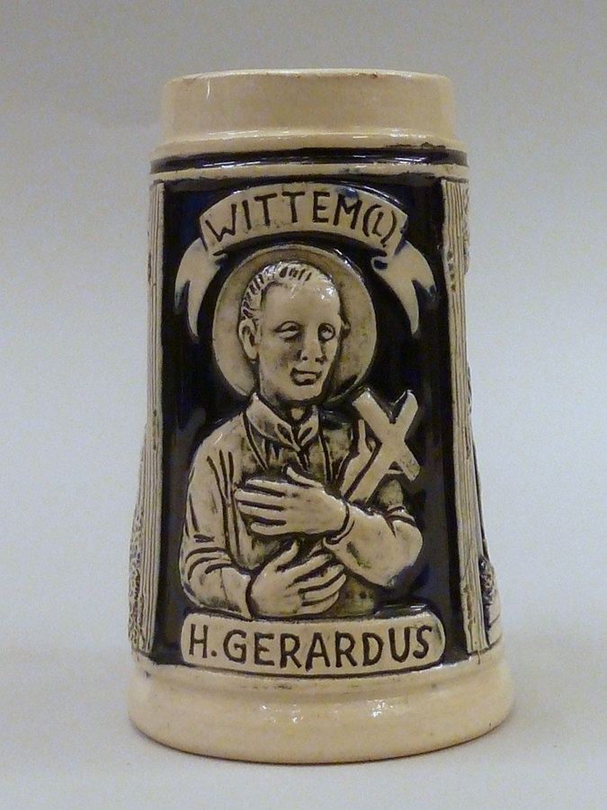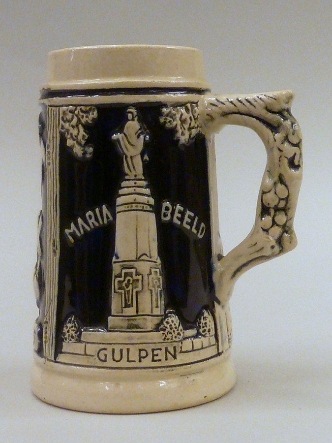 Klein formaat Keulse bierpul met afbeeldingen van klooster Wittem, H. Gerardus en Mariabeeld Gulpen