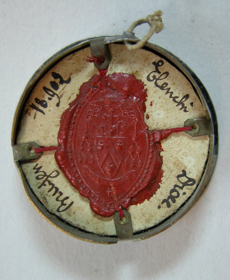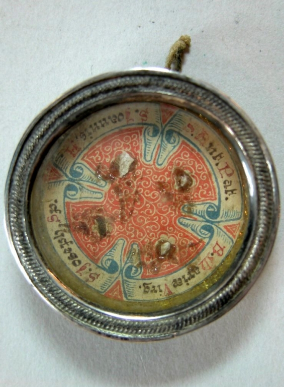 Reliekmedaillon met vier relieken ex oss. van o.a. H. Antonius van Padua en H. Johannes