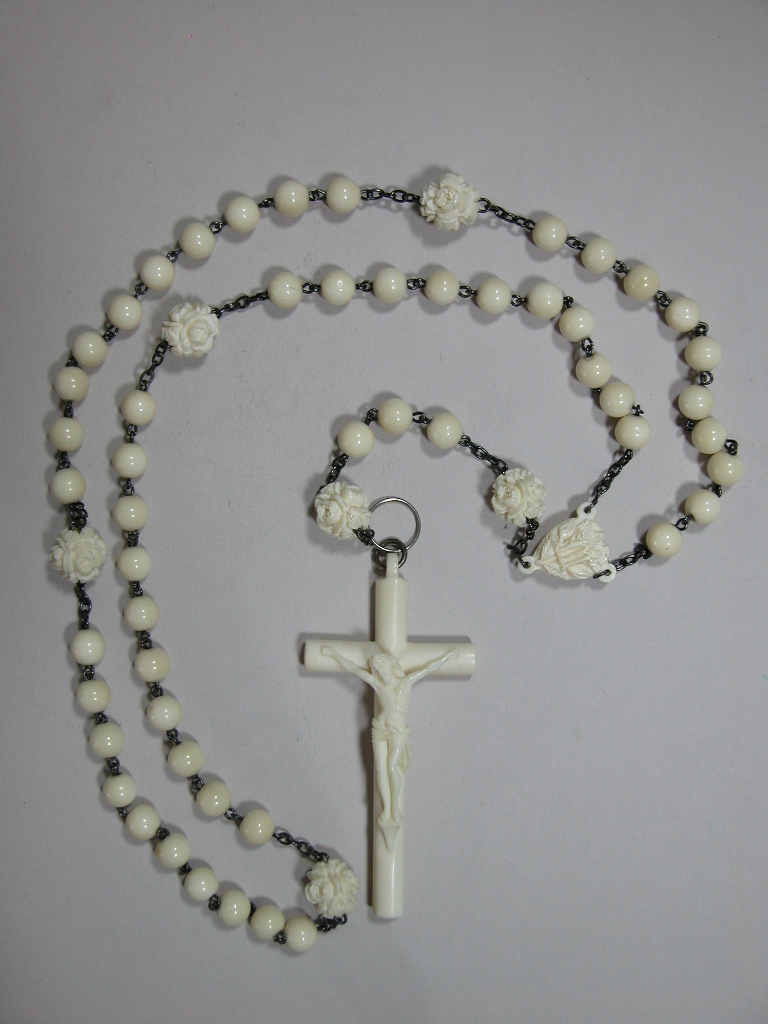 Rozenkrans met als hanger een kruis met corpus