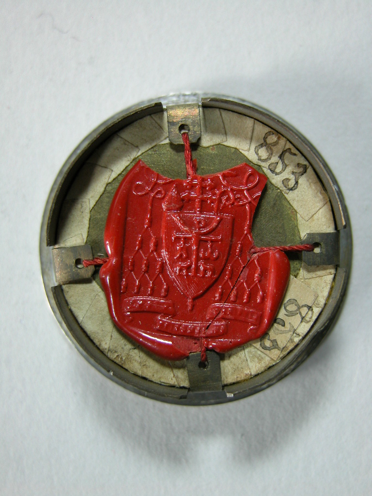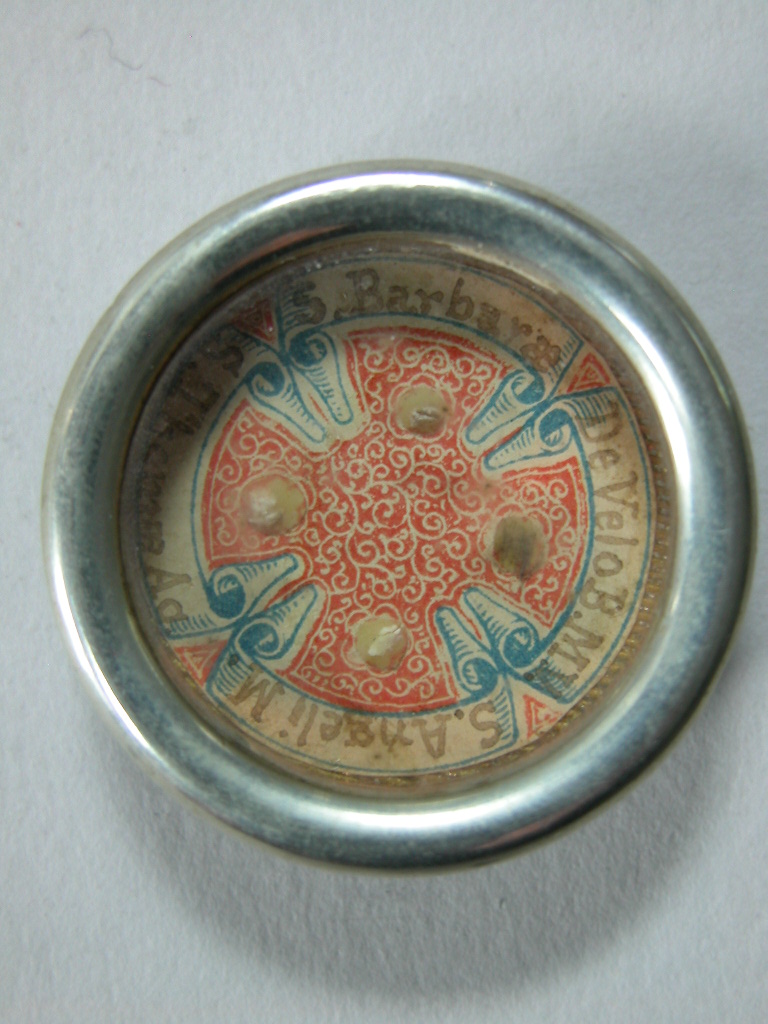 Reliekmedaillon met vier relieken ex oss. waaronder een reliek van H. Barbara