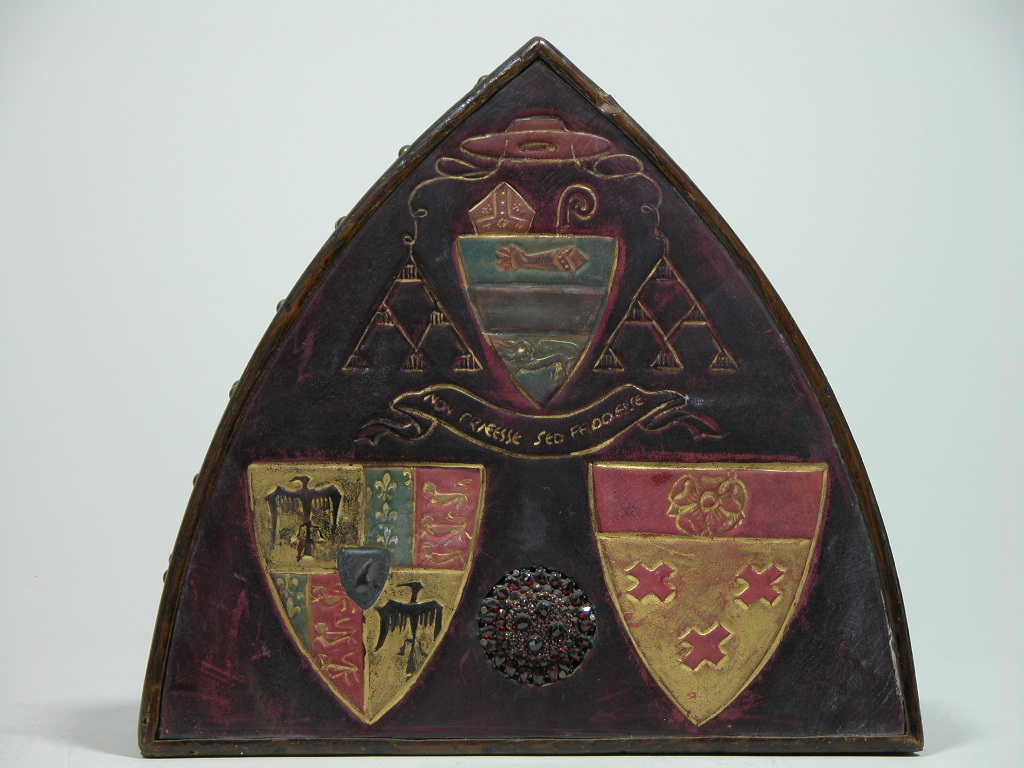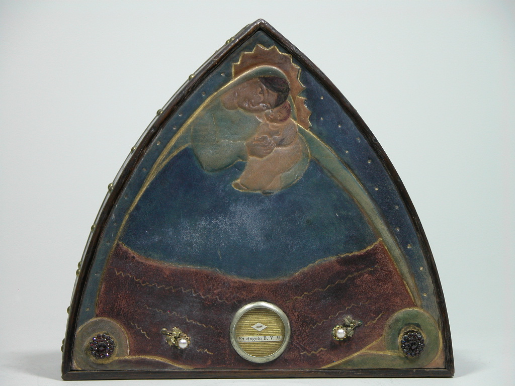 Reliekhouder met reliek ex cingulo H. Maagd Maria, aan de voorkant Maria met Kind, op achterkant drie wapenschilden: boven het wapen van Dom Jean de Puniet, rechtsonder het wapen van de Paulusabdij te Oosterhout.