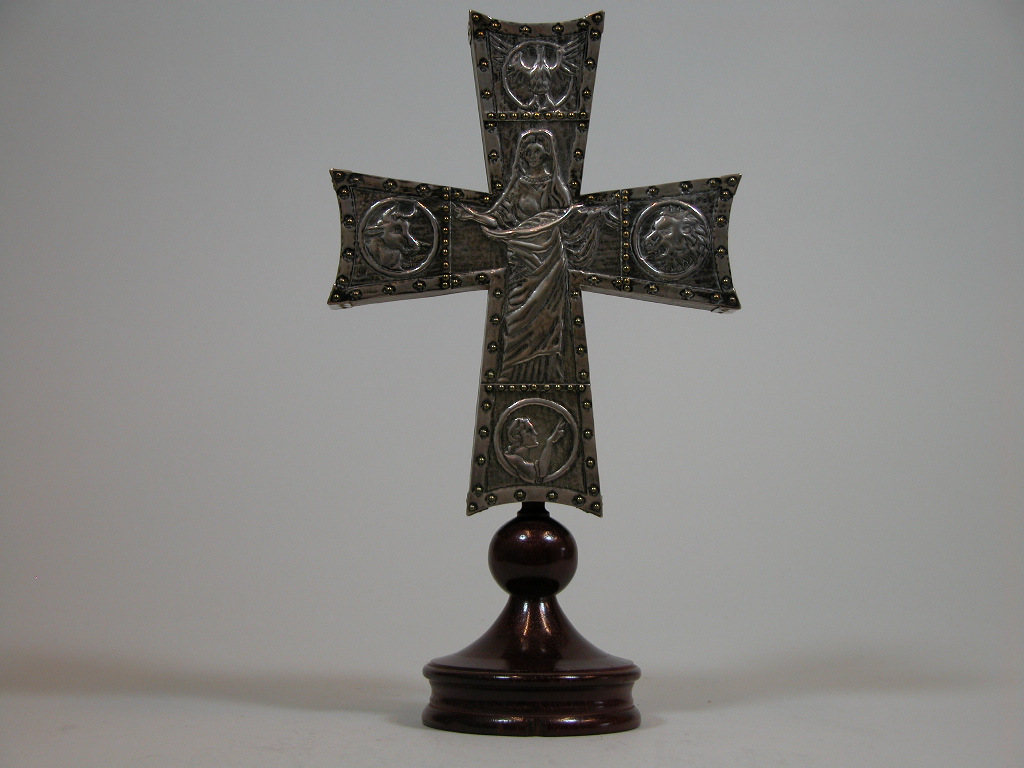 Reliekhouder in de vorm van kruis met in het midden medaillon met reliek van het kruishout van Christus, op de achterkant de vier evangelisten met Maria in het midden