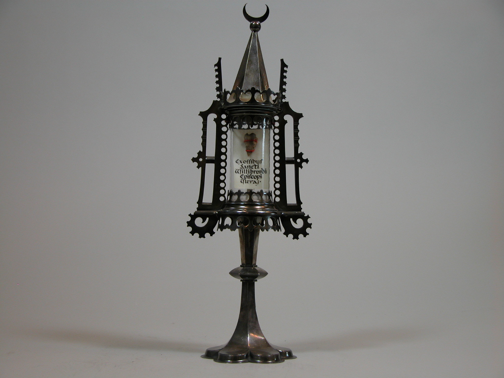 Reliekostensorium in gotische vorm op zeslobbige voet, halve maan boven, met reliek ex oss. H. Willibrordus