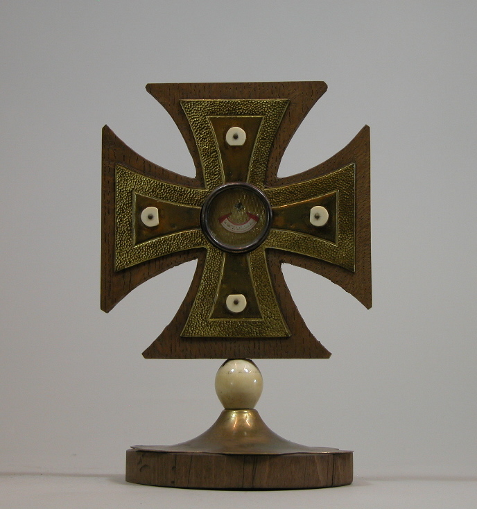 Reliekhouder in de vorm van kruis met in het midden medaillon met reliek ex oss. H. Catharina van Siena, op de voet koperbeslag in de vorm van een bloem