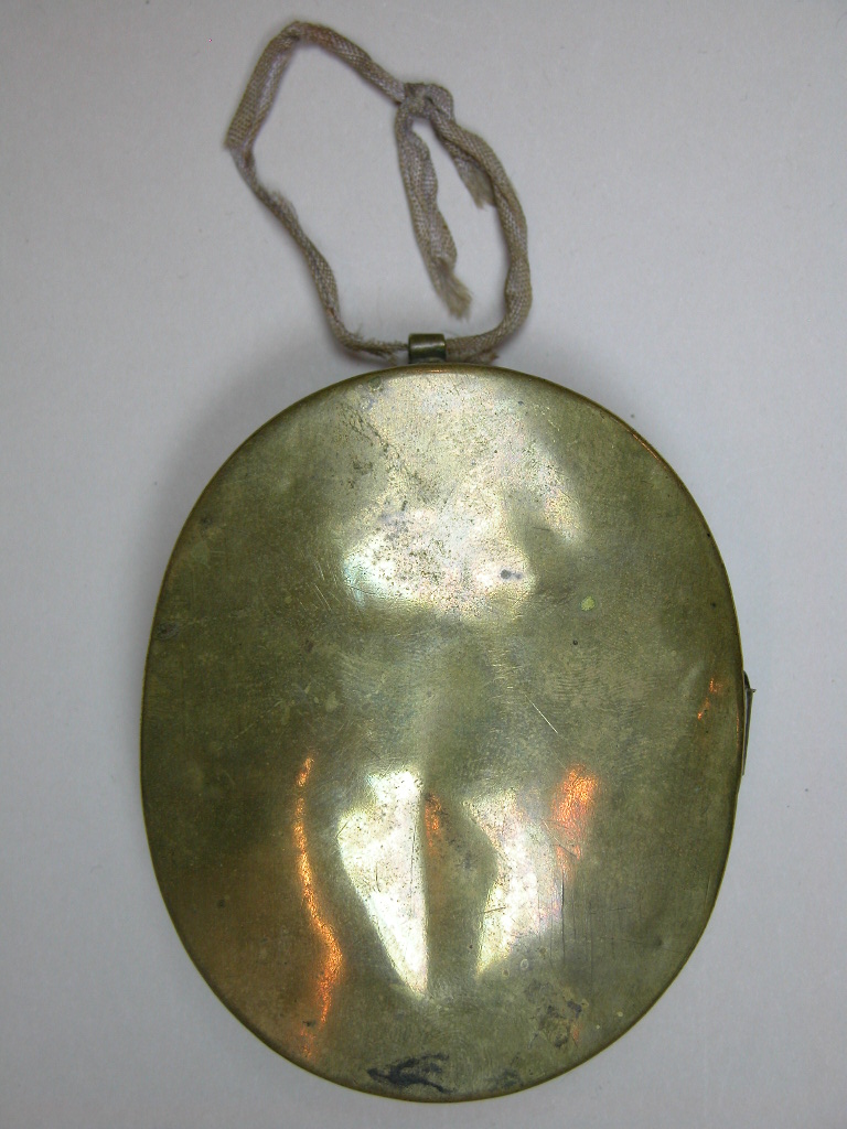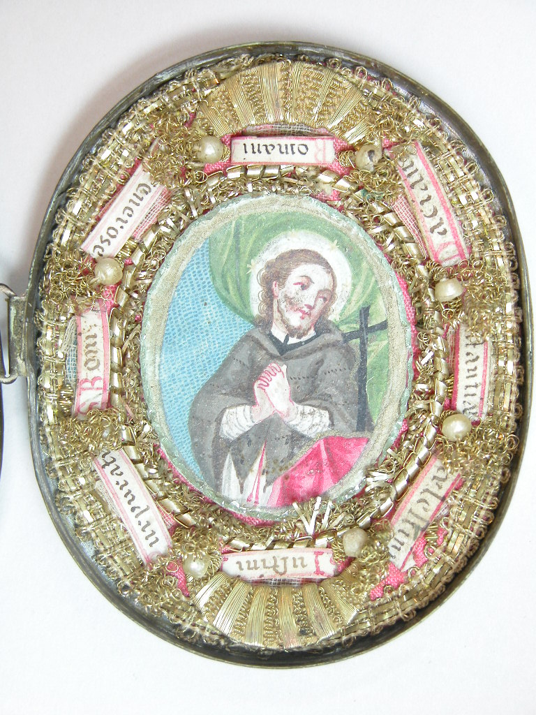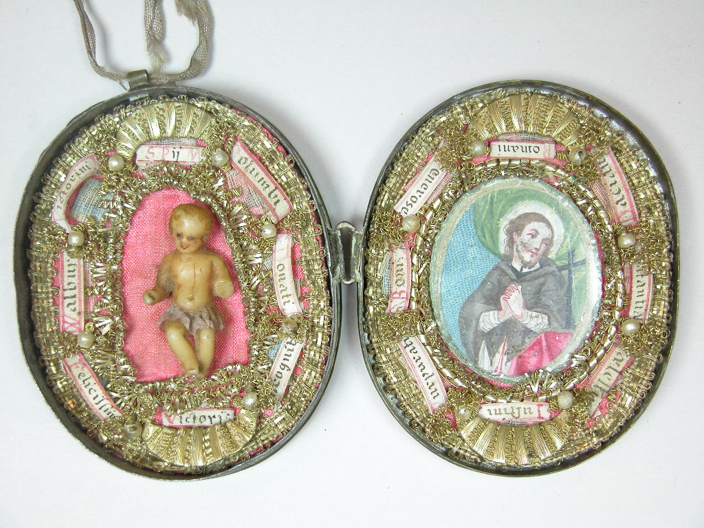 Reliekdoosje met wassen Christuskind, tekening van mannelijke heilige en zestien relieken