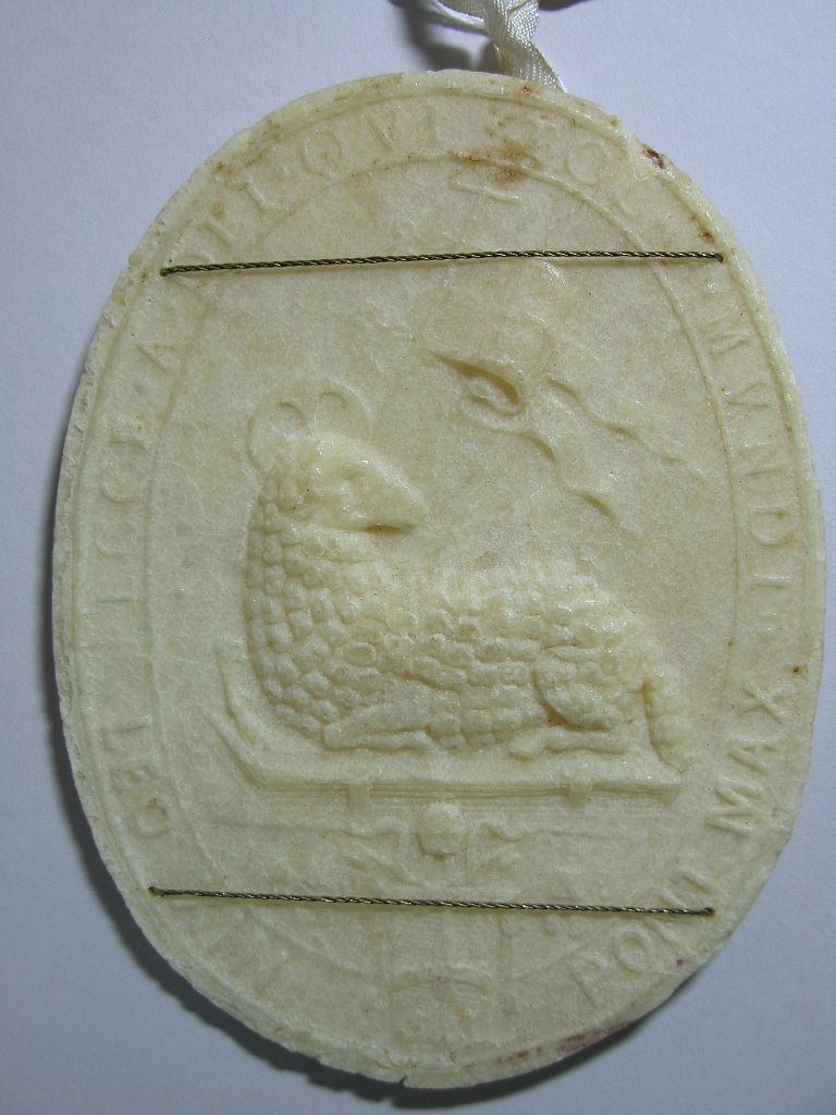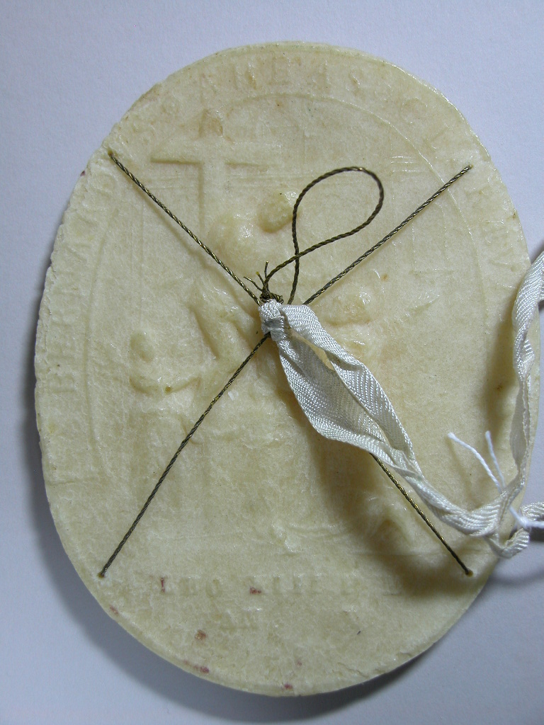 Agnus Dei van Leo XIII (1878-1903) met aan de voorzijde Lam Gods, kz. kruisafneming, bevestigd aan lint