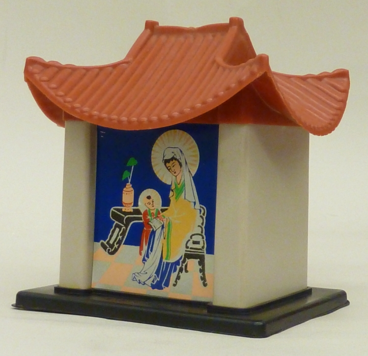 Missiebusje in vorm van huisje met Aziatisch dak, voorop Maria met kind in Aziatische kleding