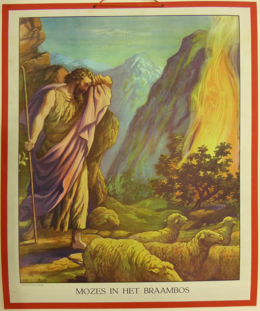 Mozes in het braambos, met Mozes die gezicht bedekt om het vuur niet te zien