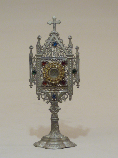 Tinnen speelgoedmonstrans, torenmodel, midden boven staande heilige, met gekleurd glas
