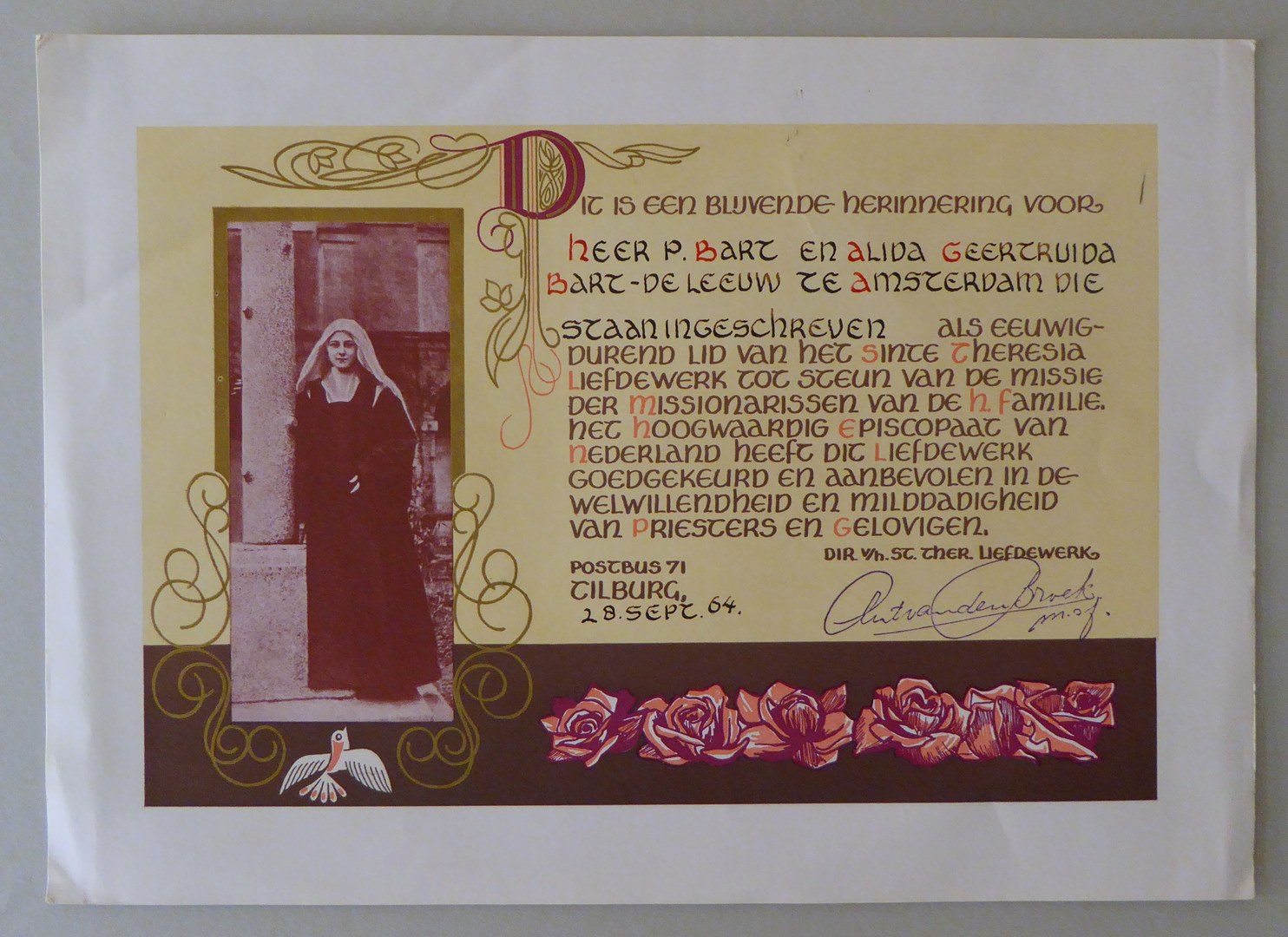 Plaat ter herinnering eeuwigdurend lidmaatschap van St. Theresia Liefdewerk, d.d. 28-09-1964