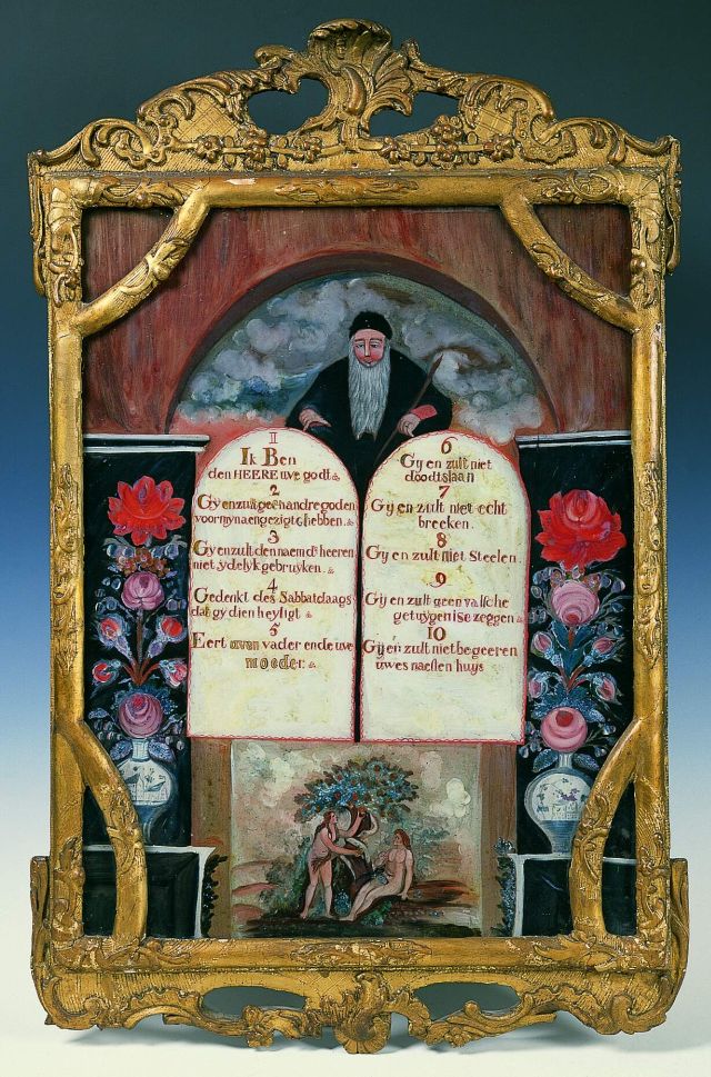 Achterglasschildering, tiengebodenbord met stenen tafelen waarboven Mozes, eronder de zondeval