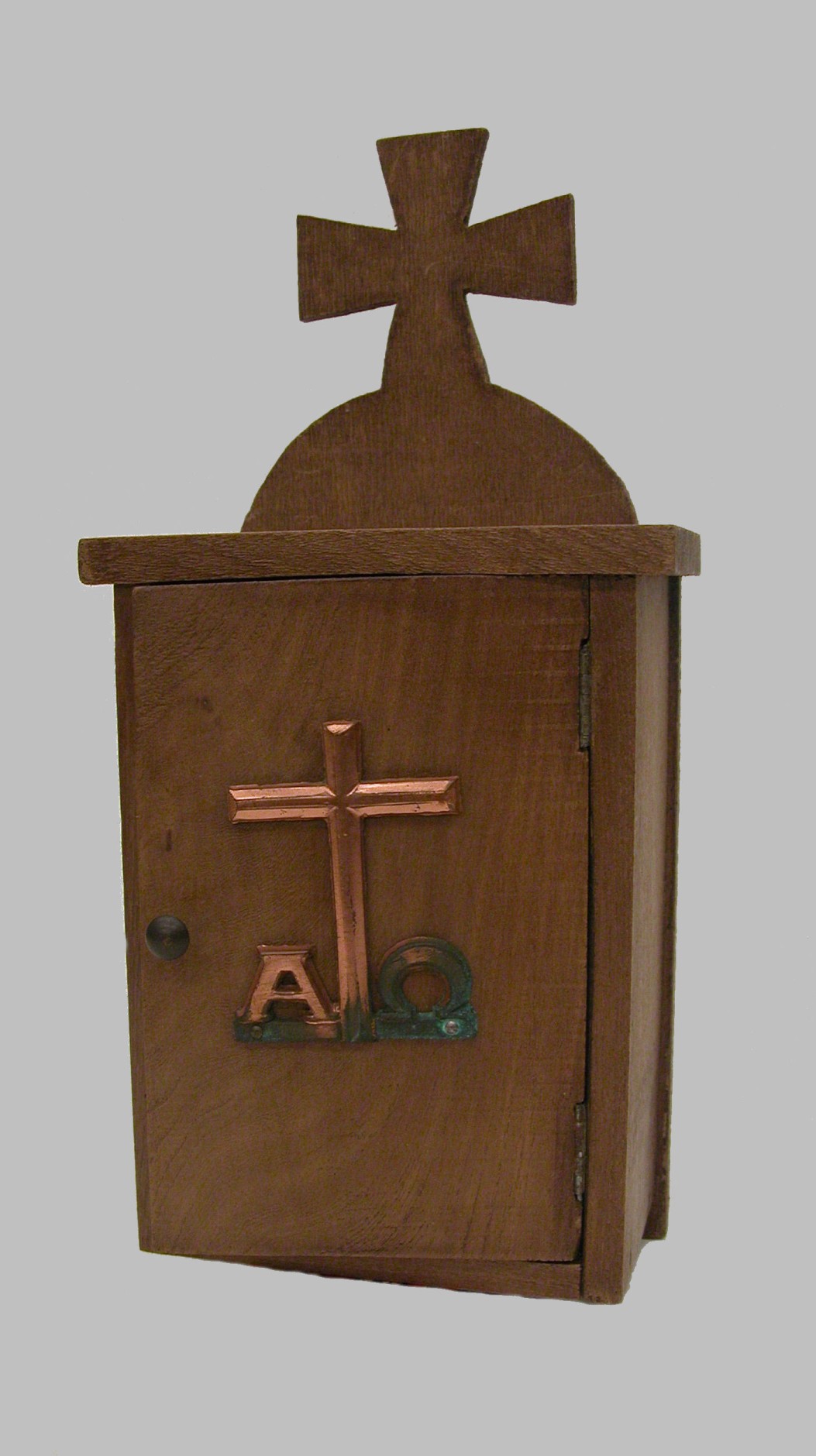 Modelaltaar met toebehoren: tabernakel met koperen kruis en "A O"