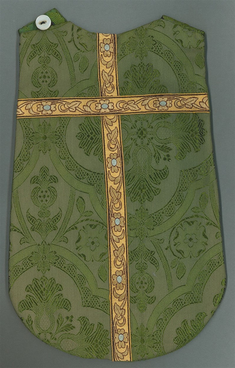 Modelaltaar met toebehoren: groen kazuifel met ingeweven vierpassen en geel kruis