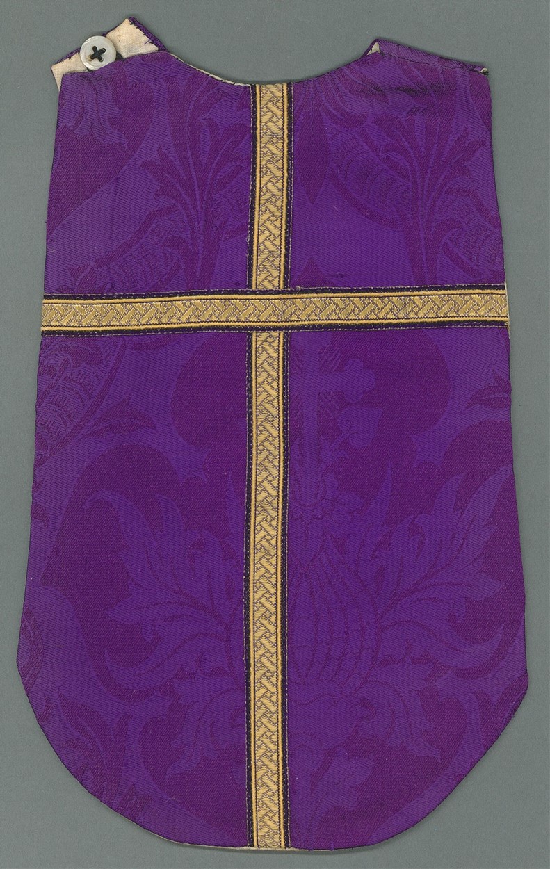 Modelaltaar met toebehoren: paars kazuifel met ingeweven granaatappels