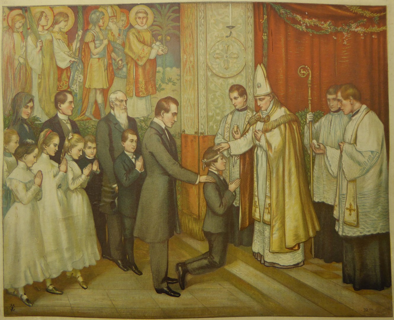 Schoolplaat, aan de ene kant voorstelling van de Doop, aan de andere kant sacrament van het Vormsel
