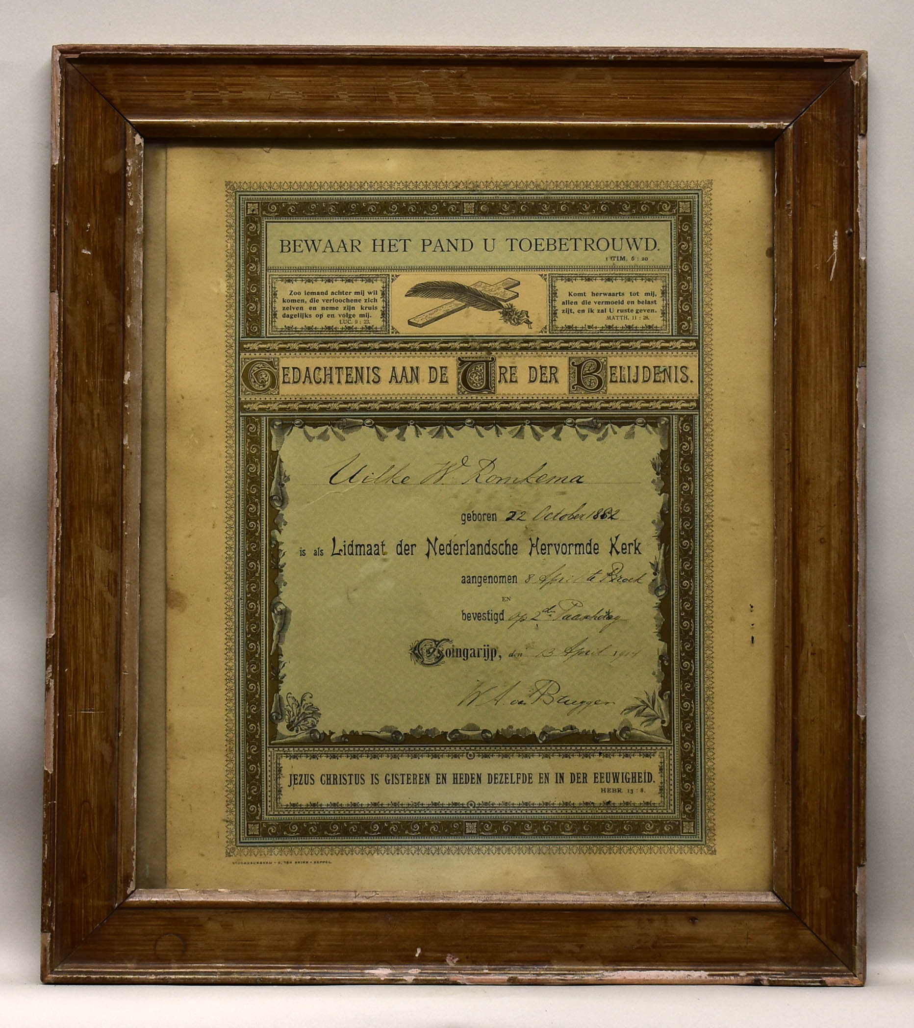 Belijdenisplaat van Uilke W. Romkema met "Bewaar het pand u toebetrouwd ..."