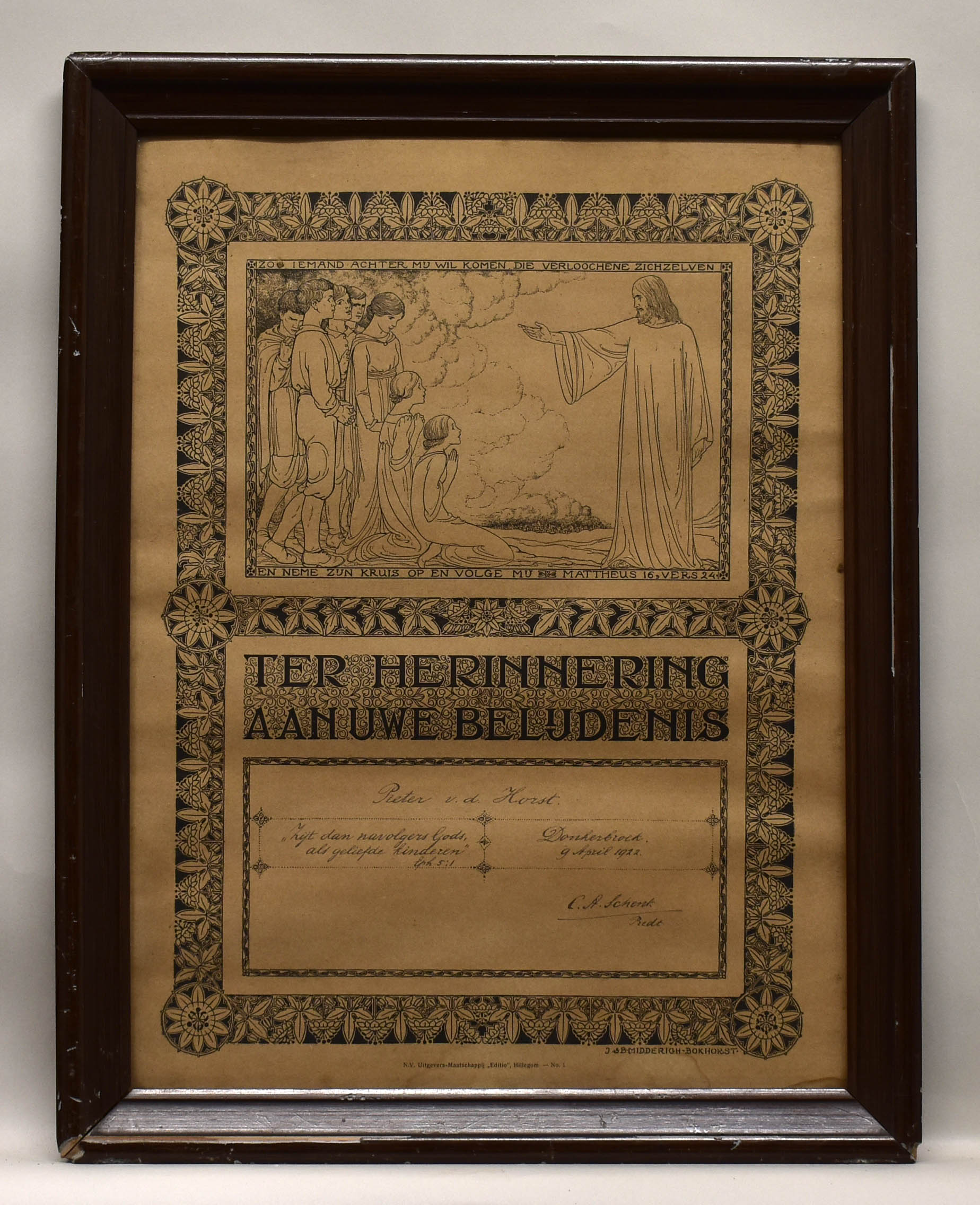 Belijdenisplaat van Pieter v.d. Horst met Christus en zeven figuren in aanbidding