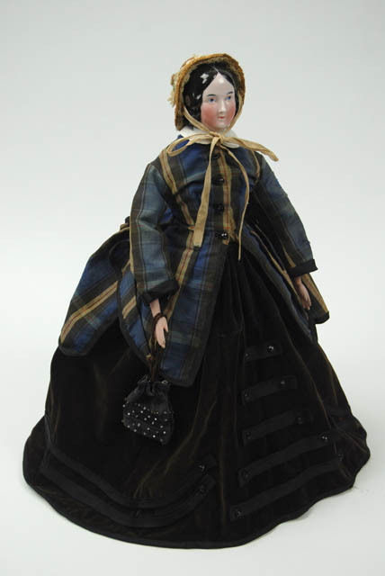 Pop met hoofd en ledematen van geglazuurd porselein, lijf van textiel, schephanden met losse duim. Voorgevormd zwart haar, gedrapeerd met krullen en oren zijn zichtbaar. Rok met jak en keu, hoed van stro, tas met kralen