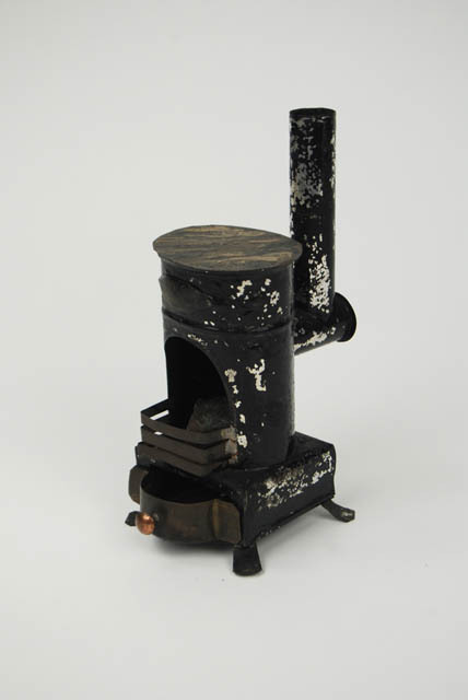 oud nummer Museum Gouda 10244 Speelgoed kacheltje (a) met losse lade (b) met koperen knop en gelakt turfje (c). Zwartgeschilderd. Poppenformaat