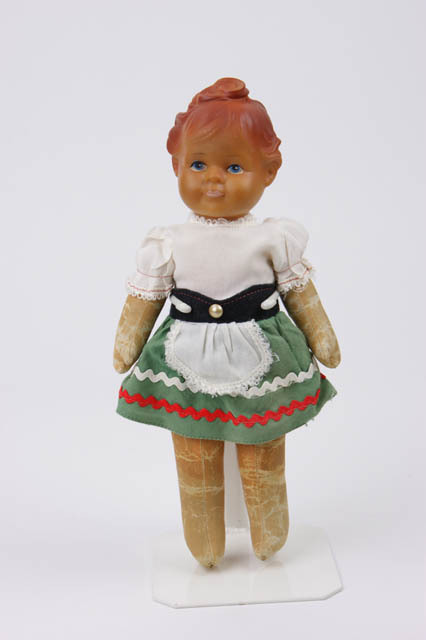 Pop met hoofd van rubber, lijf en ledematen van wasdoek