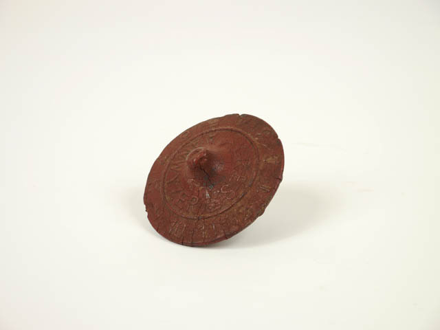 Tol als dobbelsteen, rond van donkerrode rubber met cijfers 1-12 en tekst: Aanwijzer C.R.E.S.