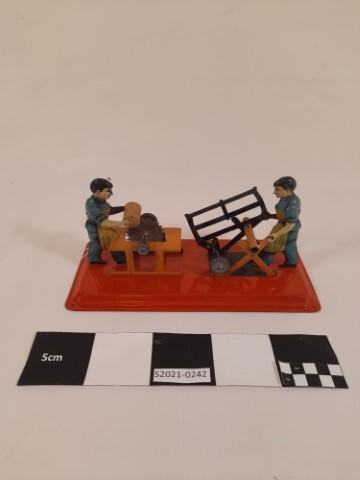 Twee mechanische figuren aan werktafels met zaagmachines. Oorspronkelijk nummer 6042
