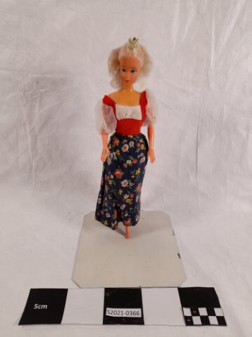 Barbie. Bloemjurk met rode vest en gehaakte pofmouwtjes. Goudkleurig kroontje en witte strik in het haar. Opschrift op de onderrug: Mattel. Inc. 1966 U.S. PattenPending, Taiwan. Oorspronkelijk nummer 1533