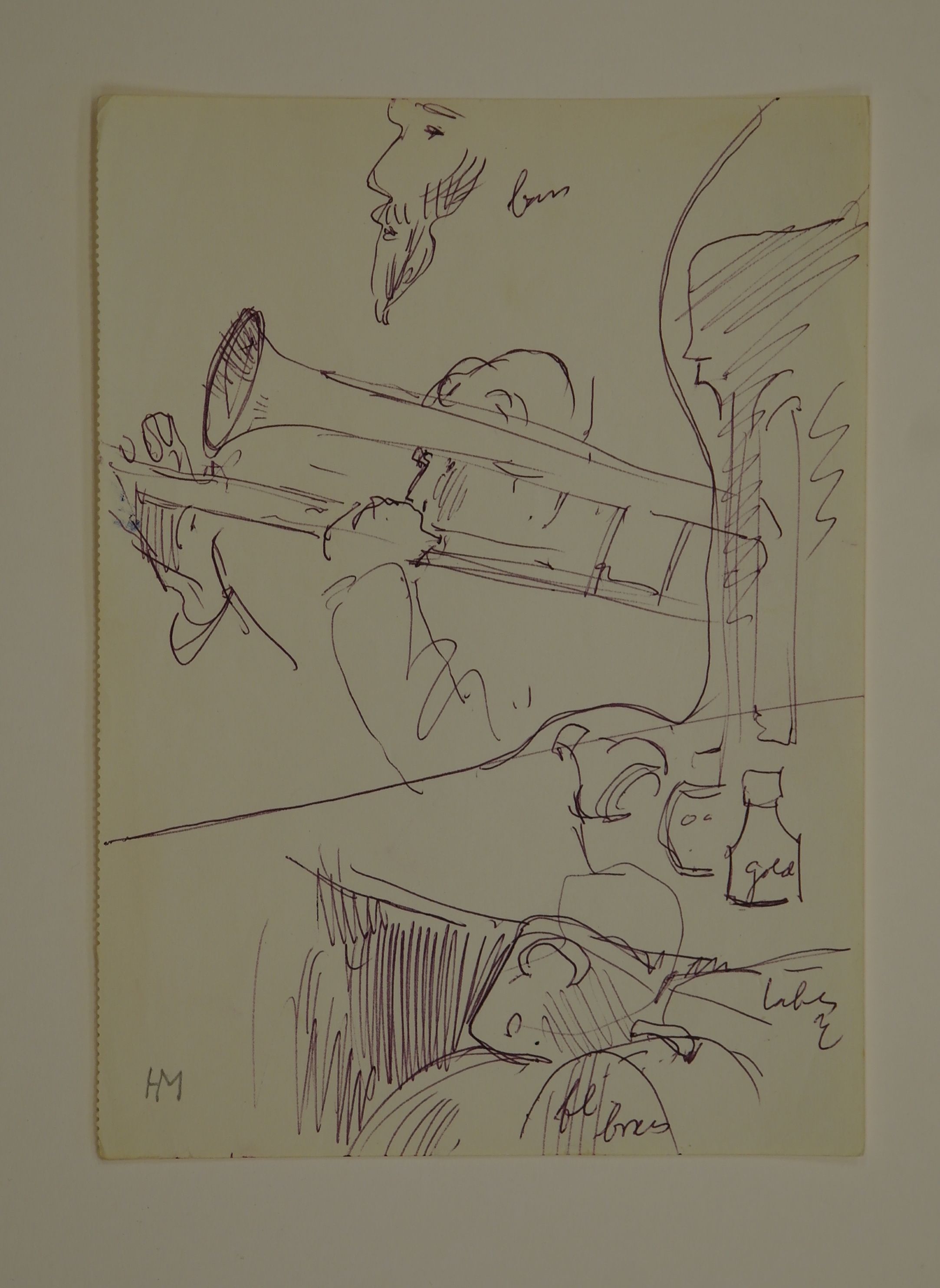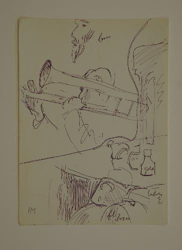 Trombonespeler in britse pub en studie van manshoofd - omstreeks 1972, pen/papier, ] gemonogrammeerd in potlood l.o.: “HM” HN-nr HMstn 054 Trombonespeler in britse pub en studie van manshoofd - omstreeks 1972, pen/papier, 210 x 150 mm, gemonogrammeerd in potlood l.o.: “HM” HN-nr HMstn 054
