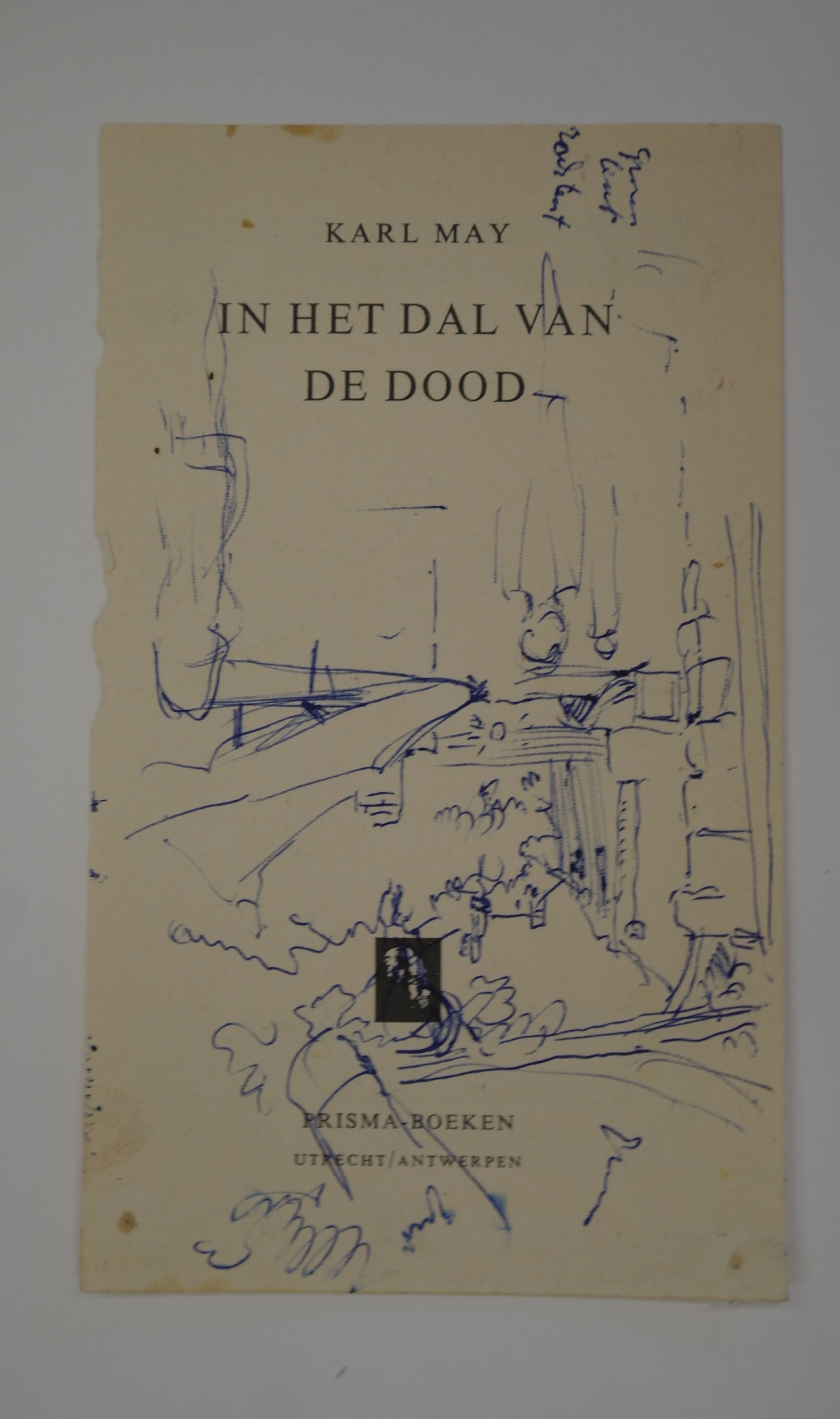 Zonder titel (Stadsgezicht met markt en passanten), blauwe balpen/papier, HN-nr M1/046/0073/E01/02 Zonder titel (Stadsgezicht met markt en passanten), blauwe balpen/papier, 180 x 105 mm, HN-nr M1/046/0073/E01/02