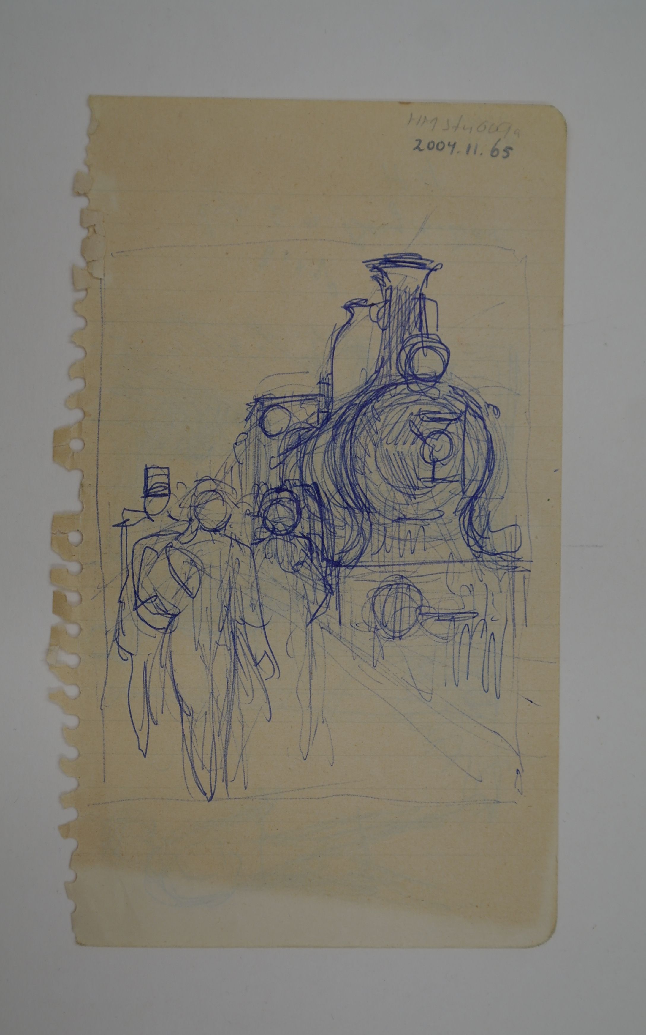 Stoomtrein op perron met uitgestapte passagiers, pen/papier, 16.5 x 10 cm, ongesigneerd en ongedateerd, HN-nr HMstn 009a