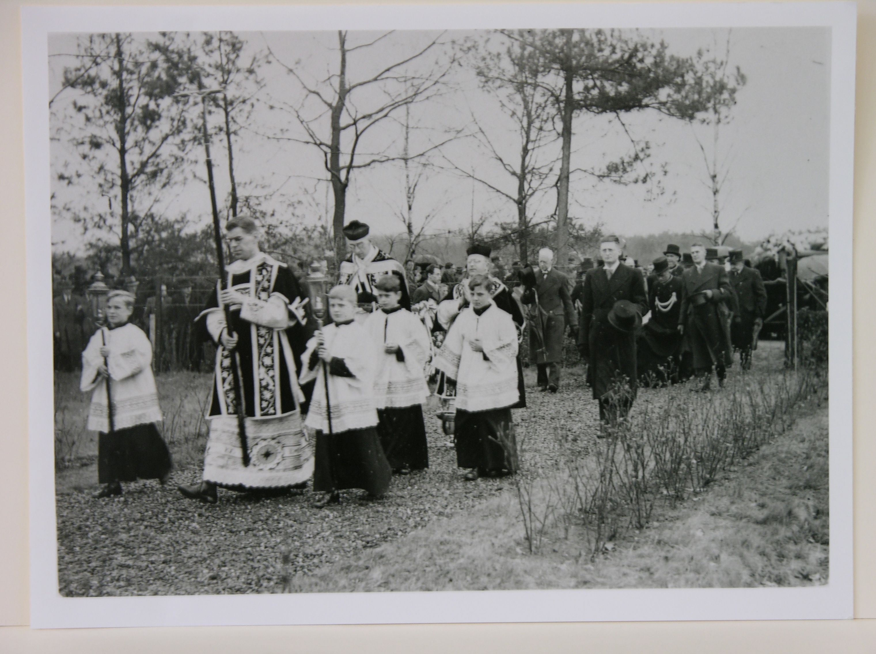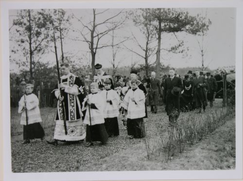 Begrafenisplechtigheid, met geestelijkheid en misdienaren in stoet voorop gevolgd door dragers.