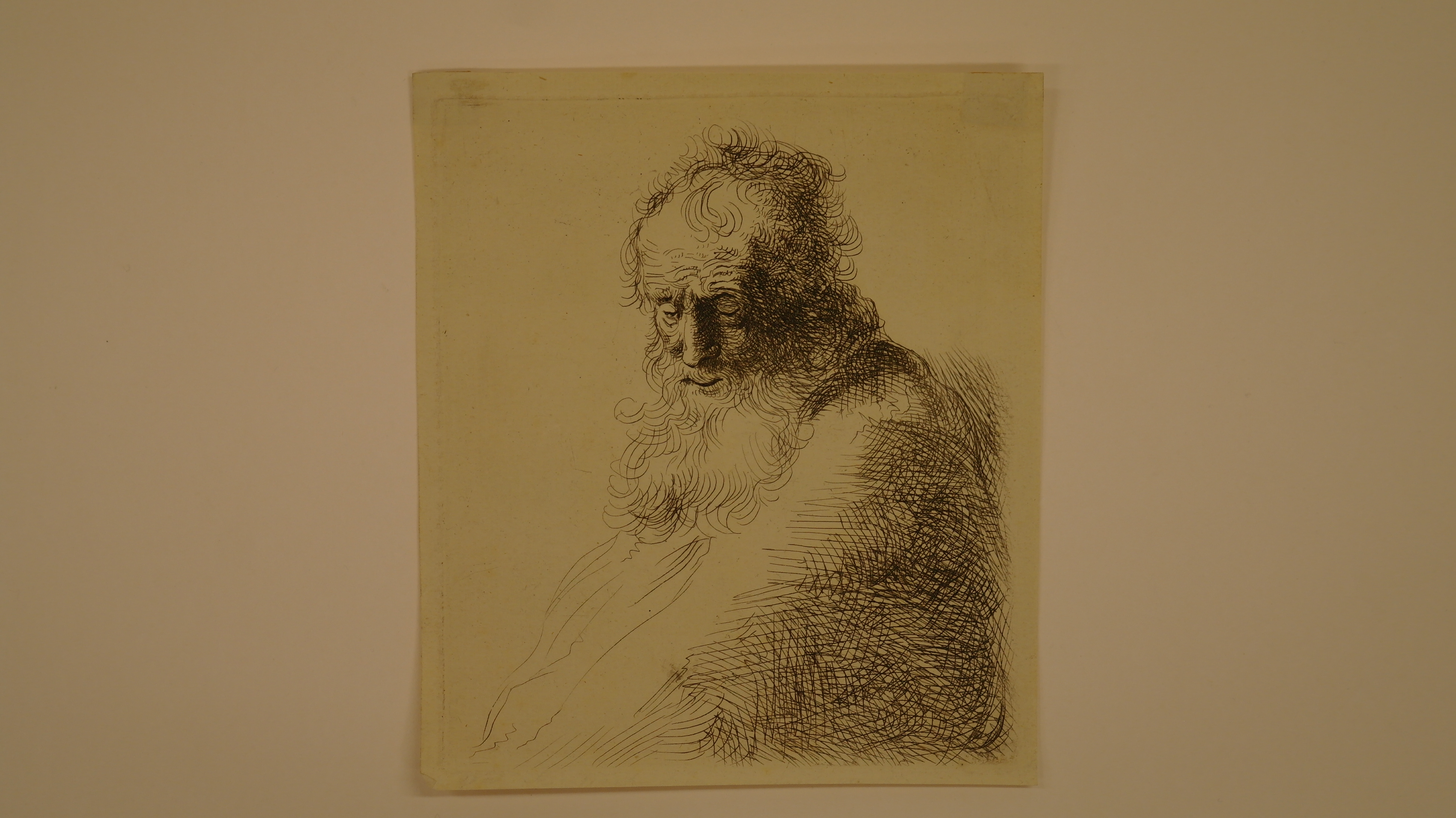 Naar Rembrandt. Man 3/4 van rechts gezien, het hoofd een weinig voorover gebogen. Volle baard en lange golvende haren tot op de schouders. ongesigneerd H&L (T. Hippert en J. Linnig) Le Peintre-graveur hollandais et belge du 19me siècle, 1879) nr. 29 a op a.z. stempels: BAG K.V. en Dubbel R.P.K.L.