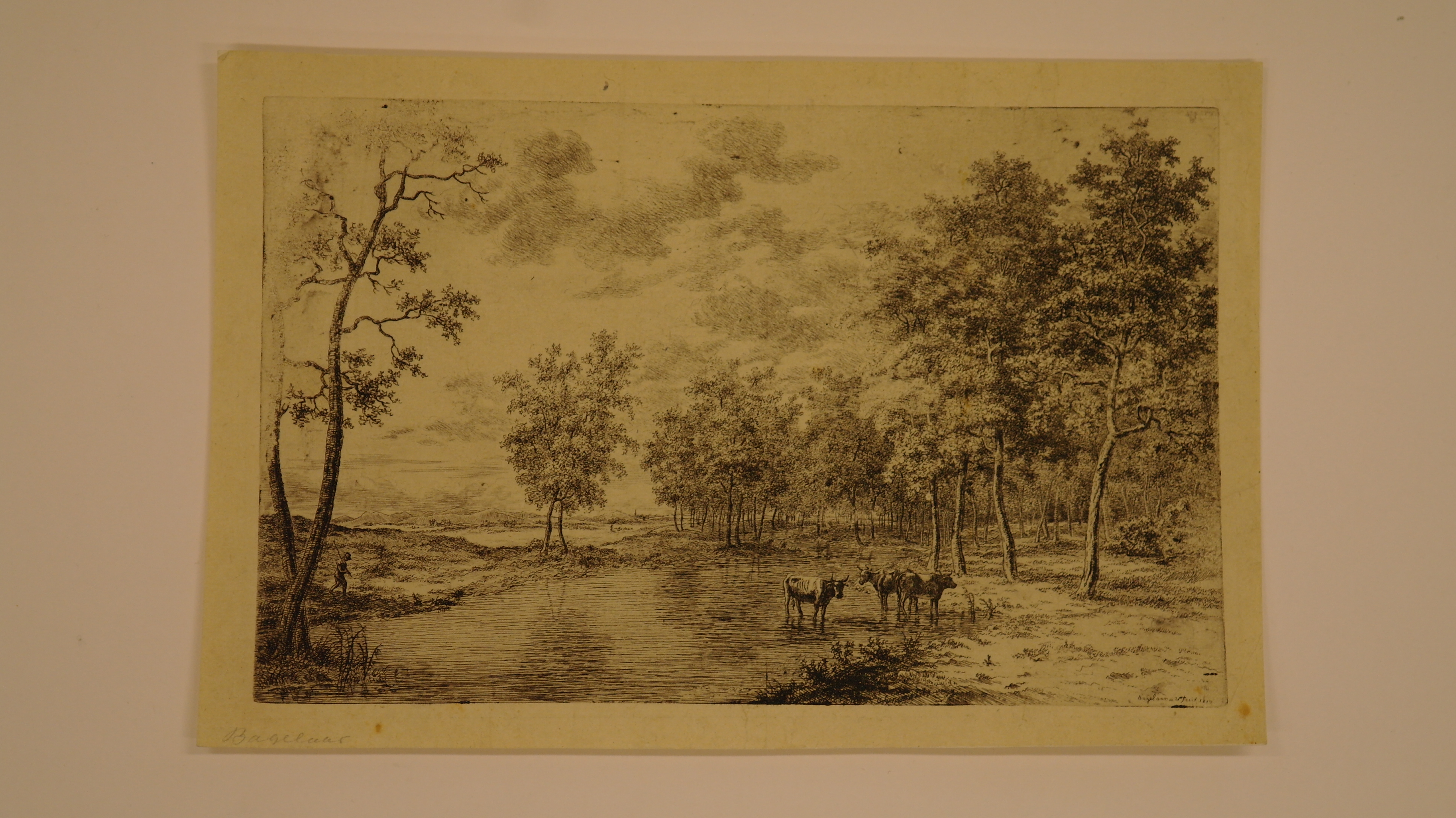 Op de oever van een water drie koeien die dorst lessen. Links een man met een stok. gesigneerd en gedateerd r.o.: Bagelaar D. et fecit 1817 H&L (T. Hippert en J. Linnig) Le Peintre-graveur hollandais et belge du 19me siècle, 1879, nr. 140 op achterzijde geen stempels