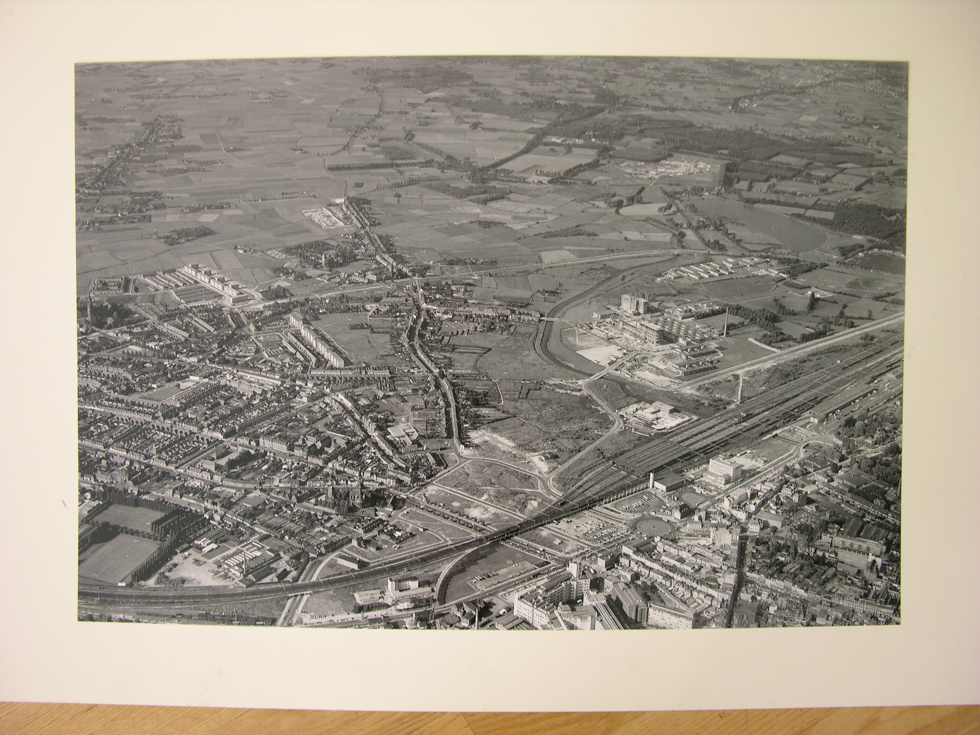 Luchtfoto: stadsgedeelte van Eindhoven ten noorden van het spoor: Woensel
