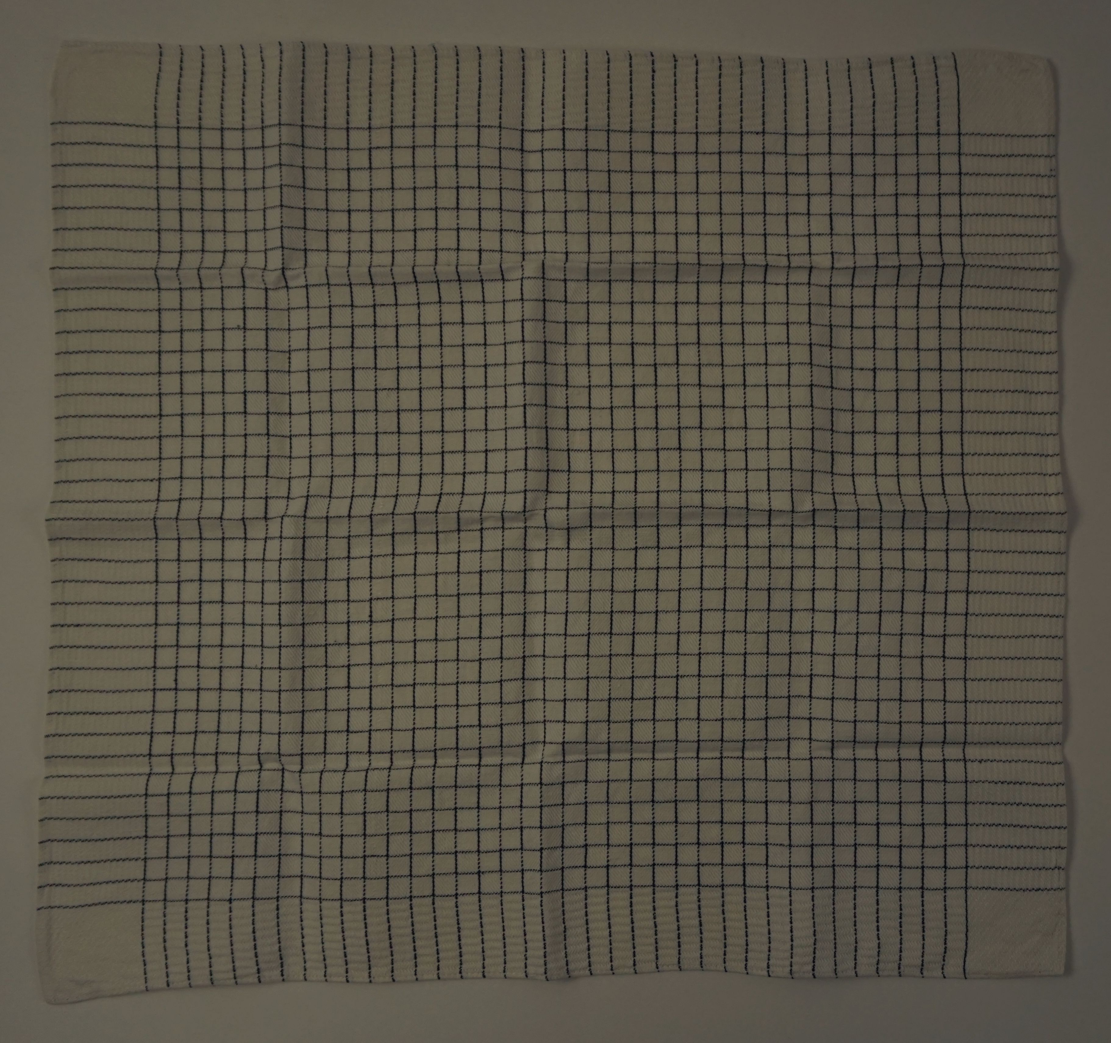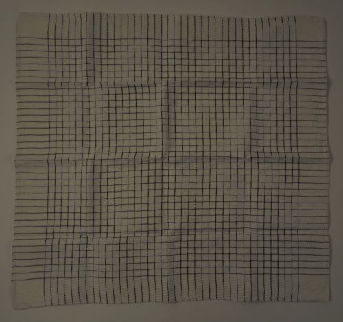 Theedoek, materiaal: linnen, kleur: wit met bruin ruitpatroon, afmetingen: 58 x 63 cm, etiket: ‘ELIAS made in Holland halflinnen/halbleinen’