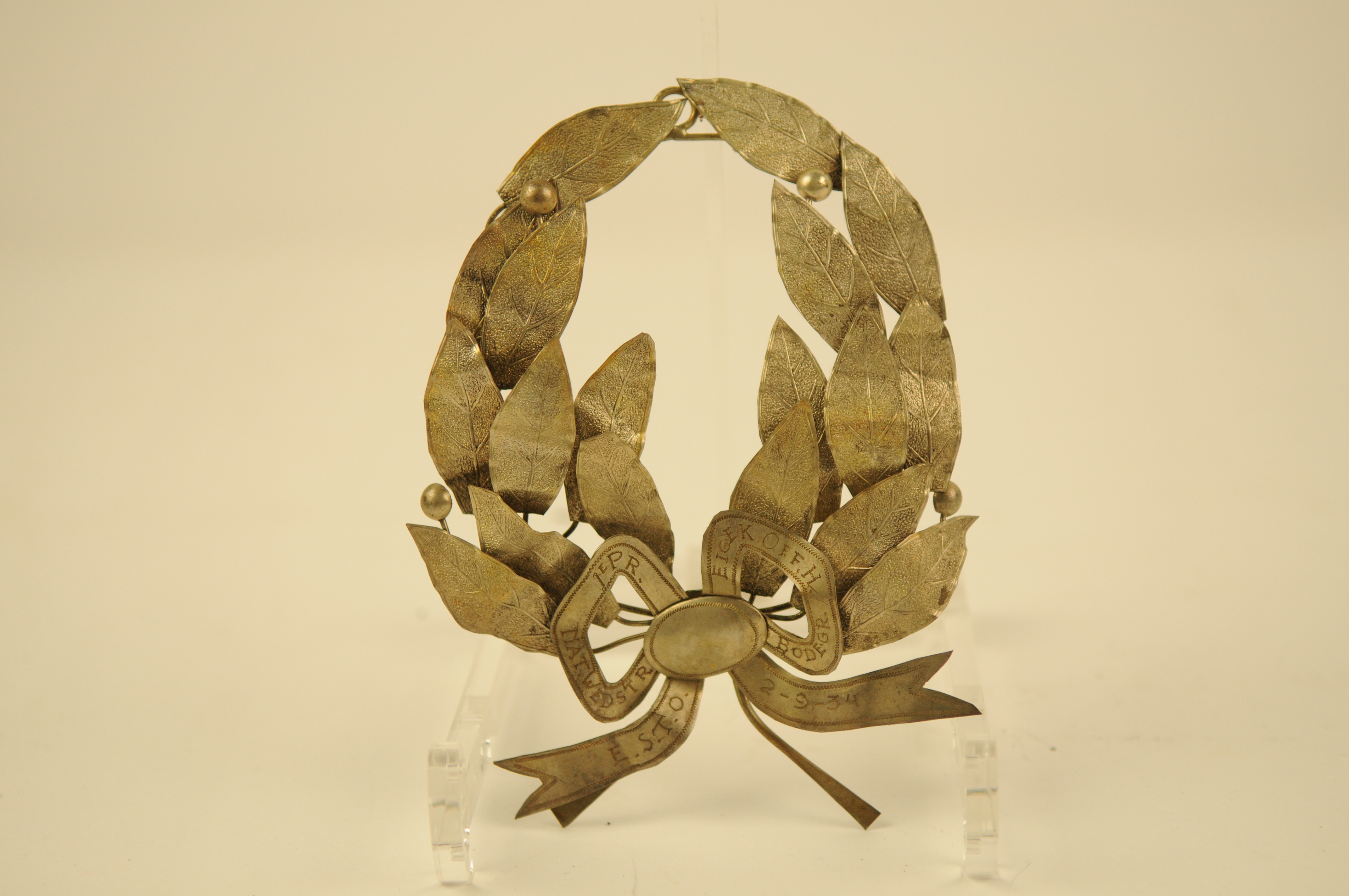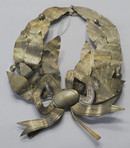 Lauwerkrans - 1934, materiaal: metaal, verzilverd en deels verguld, afmetingen: 15 x 11,5 x 2 cm, 18-bladige lauwerkrans met vier vruchten, symmetrisch uitgewerkt banderole-lint met de inscriptie: ‘1E PR. NAT. WEDSTR. EIGEK. OEF. H. BODEGR. E.S.T.O. 2-9-‘34’