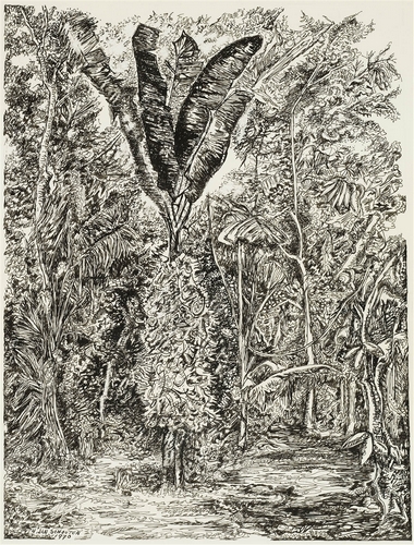 Oerwoud – 1970, oostindische inkt/papier, 420 x 320 mm, gesigneerd en gedateerd l.o.: H.JAN SCHOUTEN 1970