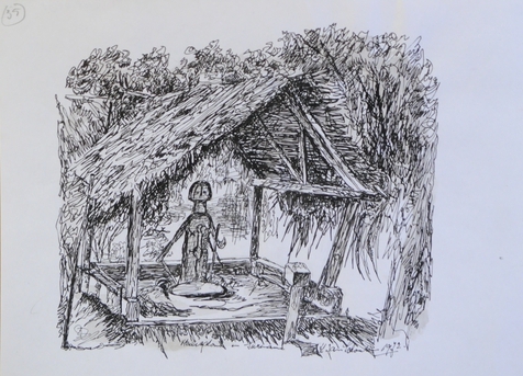 Heiligdom in Suriname – 1972, oostindische inkt, gewassen/papier, 205 x 225 mm, geannoteerd en gelocaliseerd m.o.: Heiligdom in Suriname, gesigneerd en gedateerd r.o.: H. JAN SCHOUTEN 1972