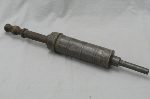 Veterinaire klisteerspuit met recht uiteinde, tin, 46,5 x 7,5 cm, cylindervormige bus van tin met schroefdraad afsluitelement waarin houten druk-handvat bestaande uit drie losse delen die middels een schroefdraad aan elkaar werden bevestigd