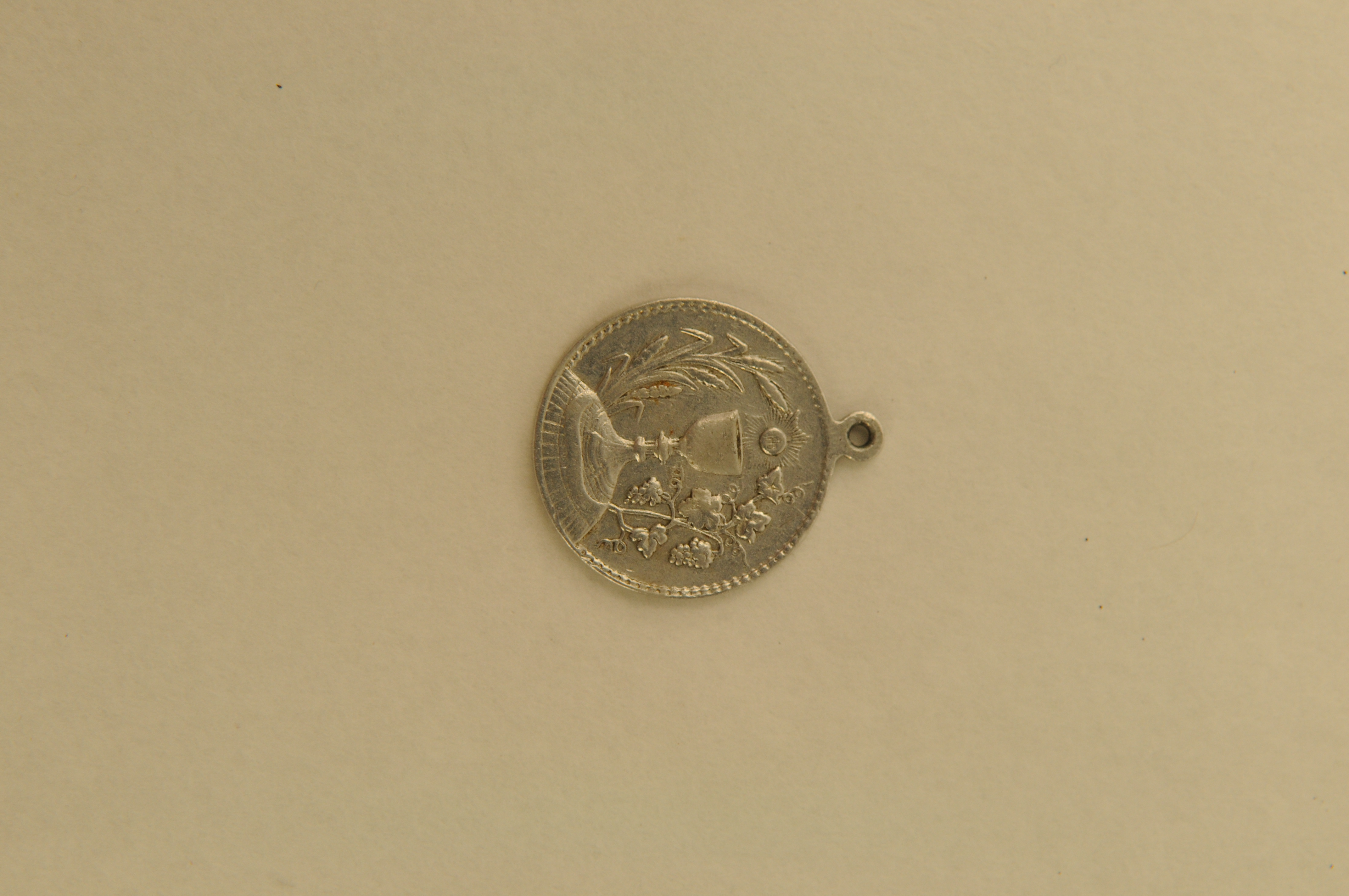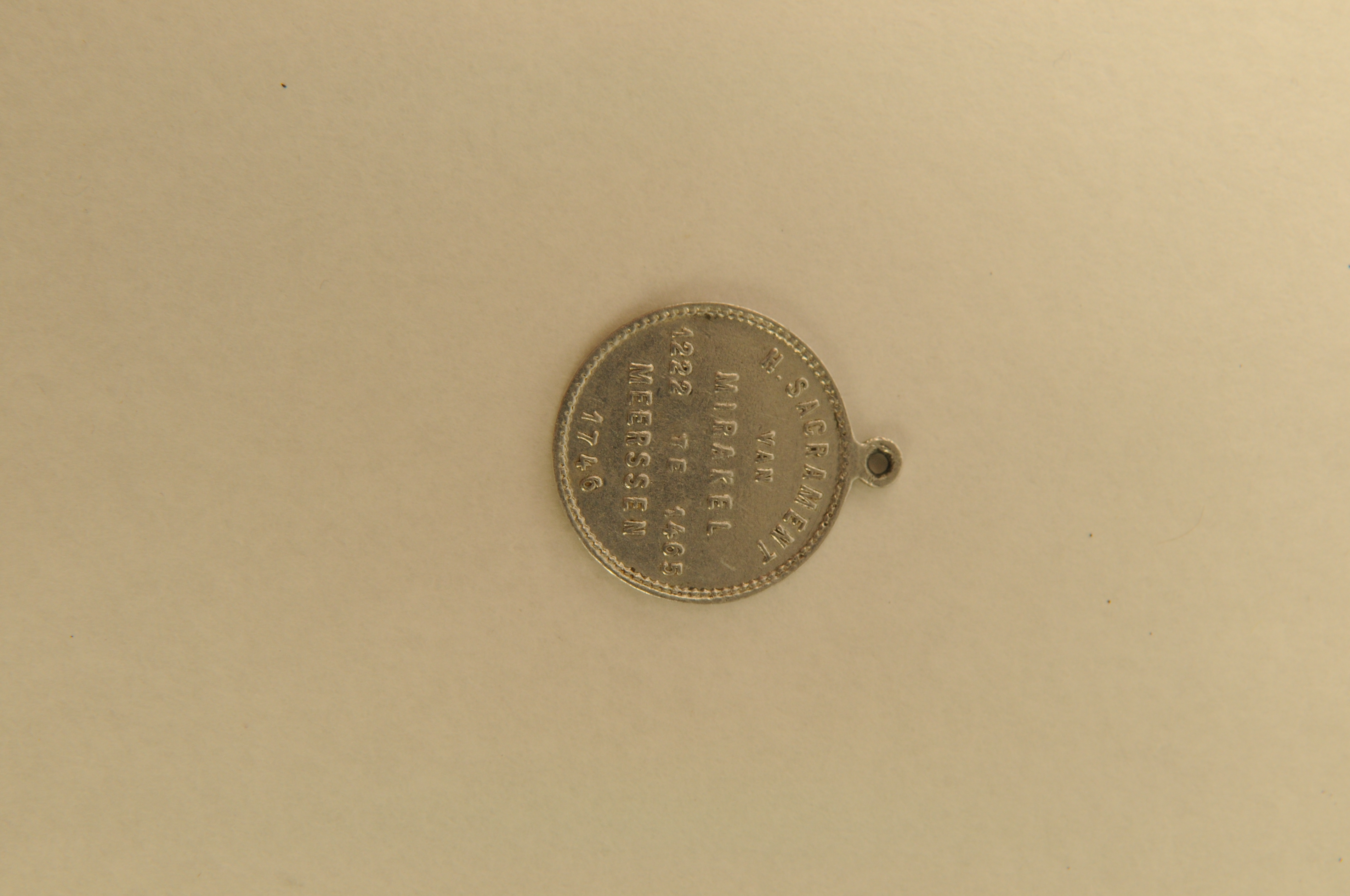 Religieuze medaille/draagpenning, materiaal: aluminium, ronde penning met op vz. afbeelding van een miskelk met daarboven IHS geflankeerd door links koren en rechts een wijnrank en op kz. reliëfopschrift ‘H. SACRAMENT VAN MIRAKEL TE MEERSSEN 1746’ en ‘1222 1465’, 3 x 2,6 x 0,1 cm