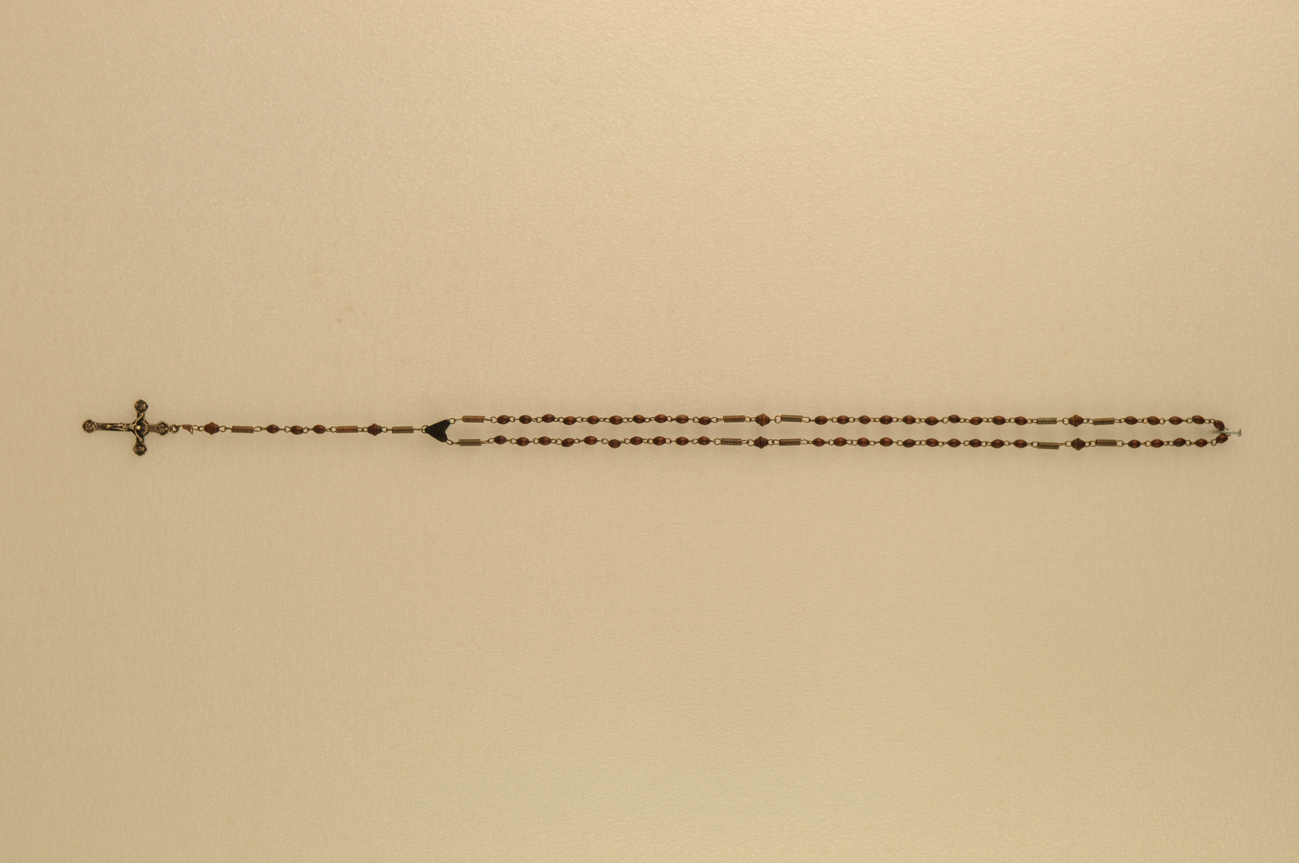 Rozenkrans – z.j., zilver, koper en natuursteen, een rozenkrans met een zilveren of verzilverde crucifix, koperen schakels en bruine stenen kralen, 54,5 x 2,7 x 0,7 cm