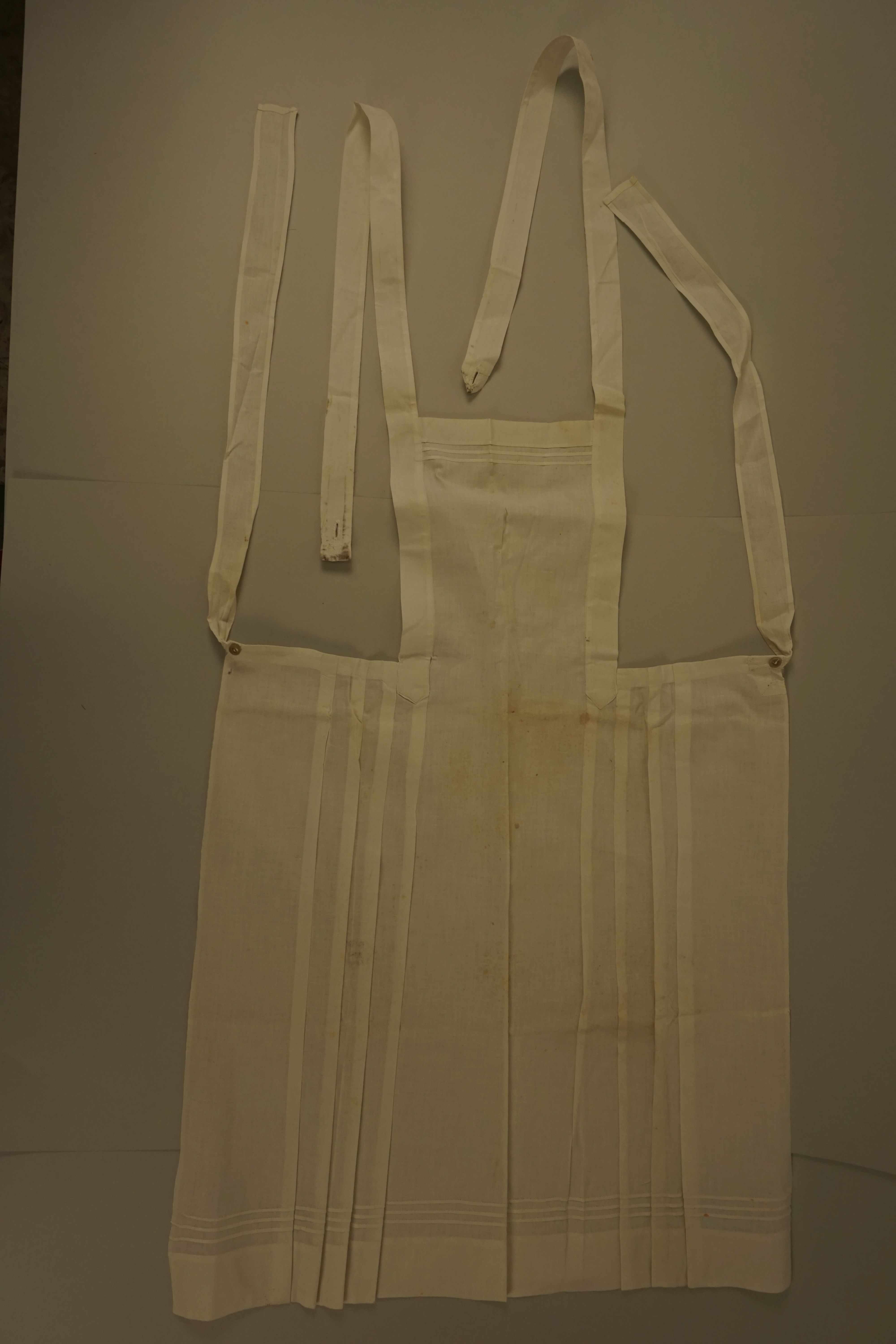 Schort voor een dienstbode, materiaal: katoen, kleur: wit, afmetingen: lengte 86 cm, breedte 79 cm, uit één stuk geknipt, 2 x 4 ingestikte plooien, onder drie randjes ingestikte plooien, ook zo bovenaan, banden uit taillehoogte aangezet, schouderbanden elk 1 knoopsgat, taillebanden elk 1 knoopje