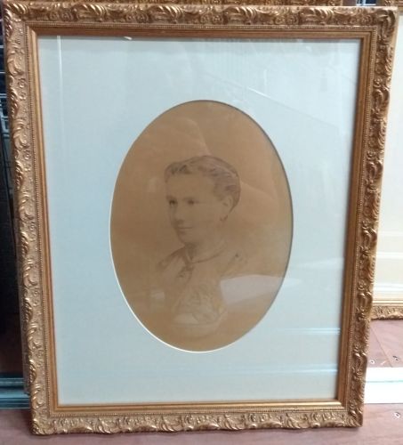 Potloodtekening van vrouw en profil. Tekening in wit ovalen passepartout in goudkleurige lijst.