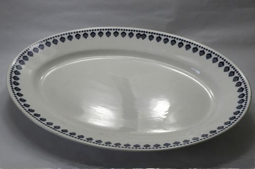 Ovale schaal - 1e kwart 20e eeuw, aardewerk/geglazuurd, kleur: blauw op wit fond, afmetingen: hoogte 5 cm, lengte 41 cm, breedte 28 cm, witbakkend aardewerk met blauwe versiering en glazuur; versiering in de vorm van blauwe ruitvormen en ineengeschoven v-vormen langs de rand, op onderzijde het firma-stempel 'WITTENBERG' met een gevierendeeld wapen met gearceerde velden ...