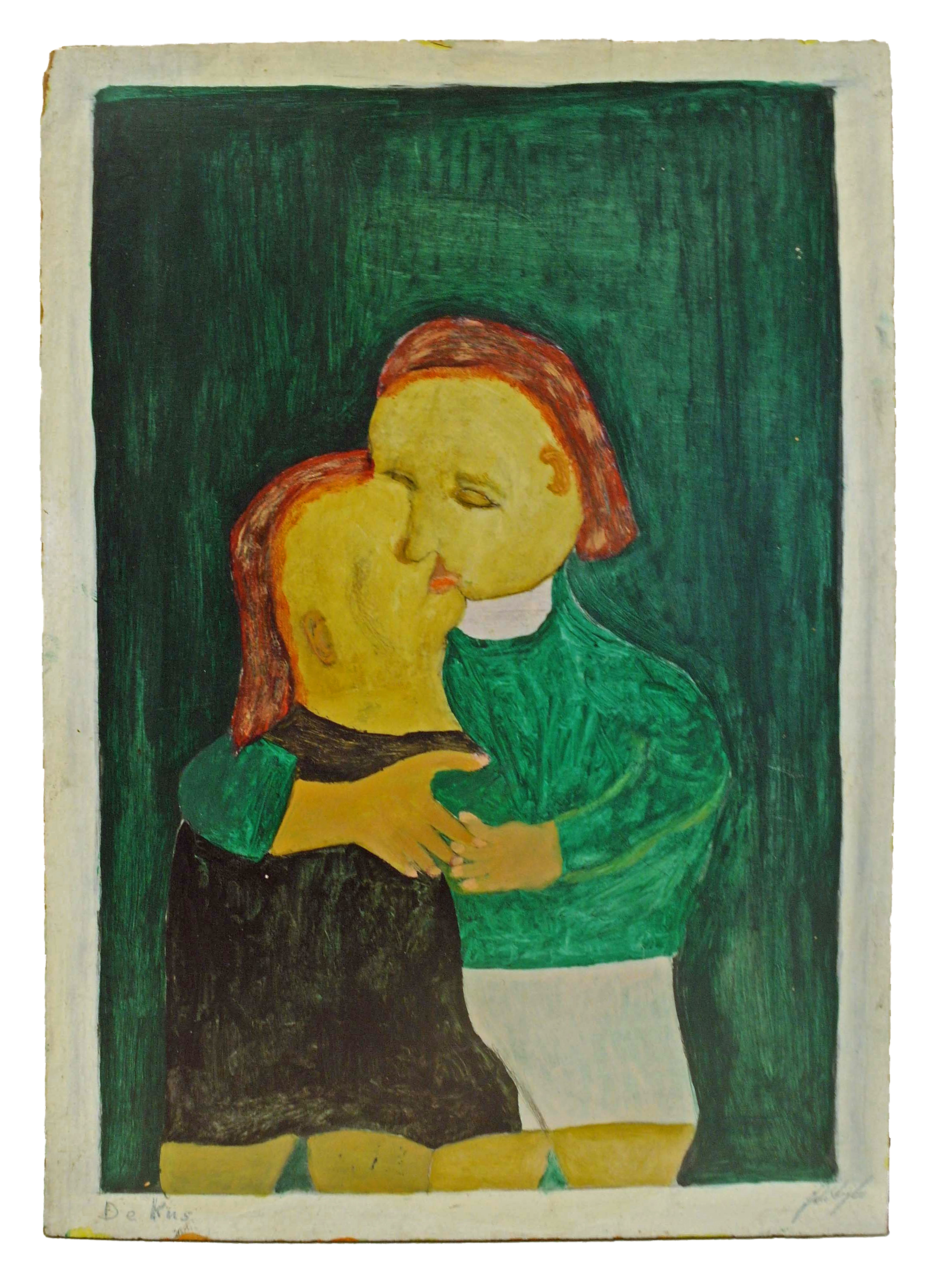 'De kus', olieverf op triplex, 34 x 23 cm, gesigneerd r.o.: Joh. Strijbos, getiteld l.o.: De kus,