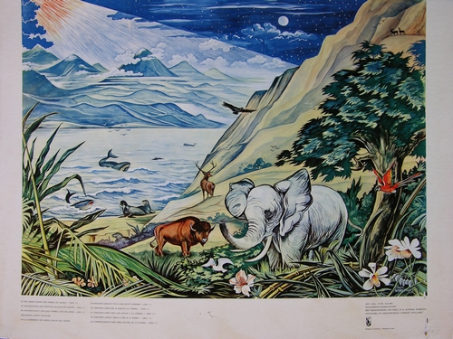 Schoolplaat met titel: ' De Schepping' , kleurenlithografie/papier/karton, tekening/ontwerp: Ben Horsthuis, uitgave: St. Gregoriushuis, Utrecht, druk: Missiehuis Steyl, serie Bellarminus Bijbelplaten nr. 1, gesigneerd r.o.: Ben Horsthuis, onder voorstelling het opschrift: In het begin schiep God hemel en aarde (Genesis 1: 1), afmetingen 630 mm x 750 mm app. eccl. Ultr. 10-2-1950
