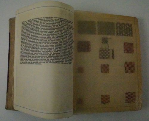Leerboek bindingsleer, materiaal: divers, kleur: divers, lengte 33 cm., breedte 29 cm., boek van de Hogere Textielschool in Tilburg, heeft toebehoord aan E. v. Spaendonck, Ringbaan-West, Tilburg Eigendom geweest van dhr. E. van Spaendonck, Ringbaan Oost 206, Tlburg