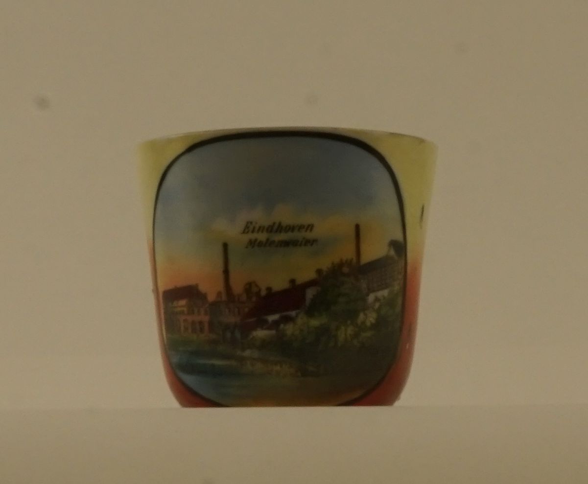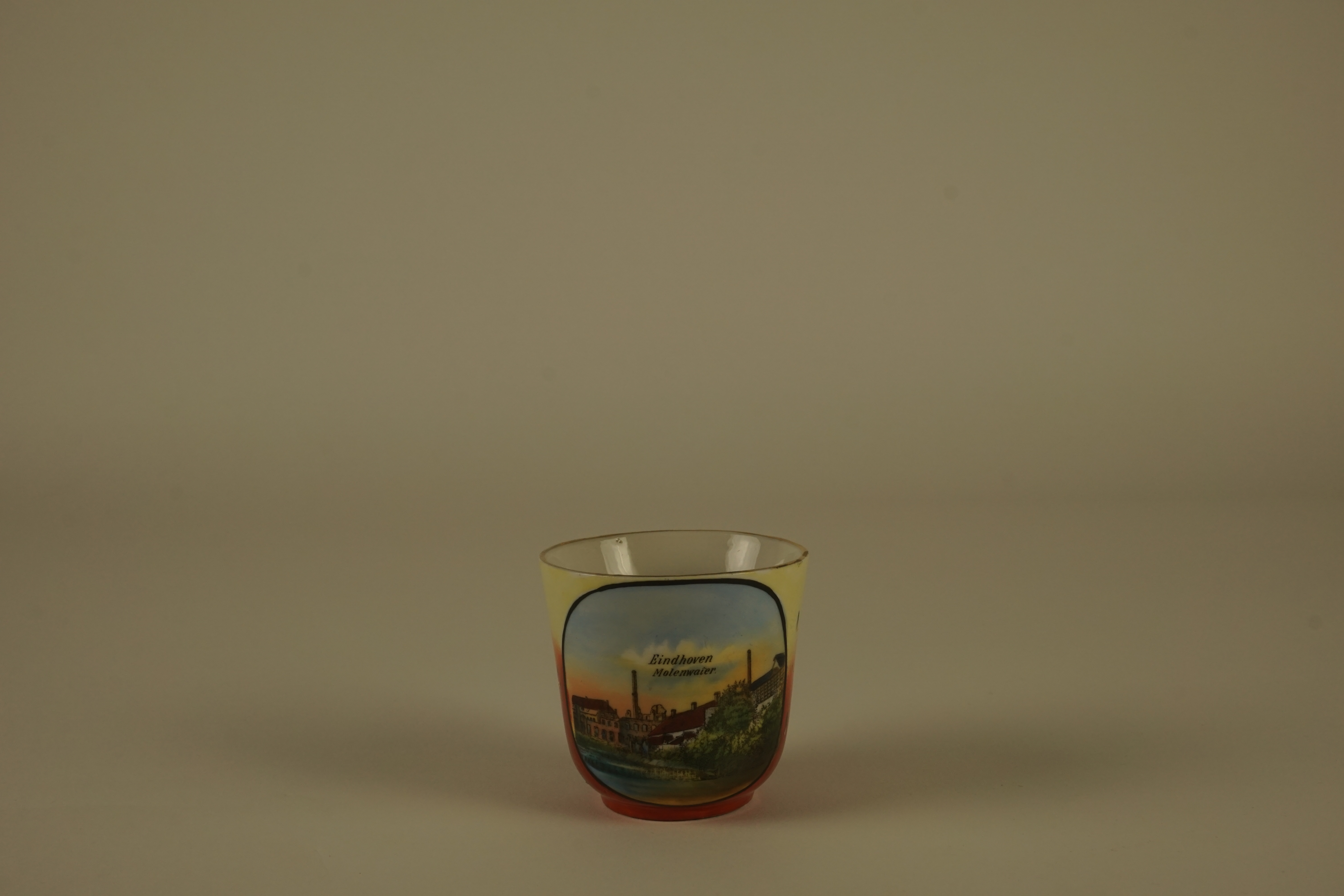 Kopje - 1e helft van de 20e eeuw, materiaal: porselein, afmetingen: 7 x 9,5 x 7,5 cm, geglazuurd kopje, rood, groen met cremegeel motiefje, onder op de bodem gemerkt met stempeltje: 'W.C.G.', in ovaal veld aan de voorzijde: afbeelding van 'Molenwater Eindhoven' (stadsgezichtje) , als titelopdruk 'Molenwater Eindhoven'
