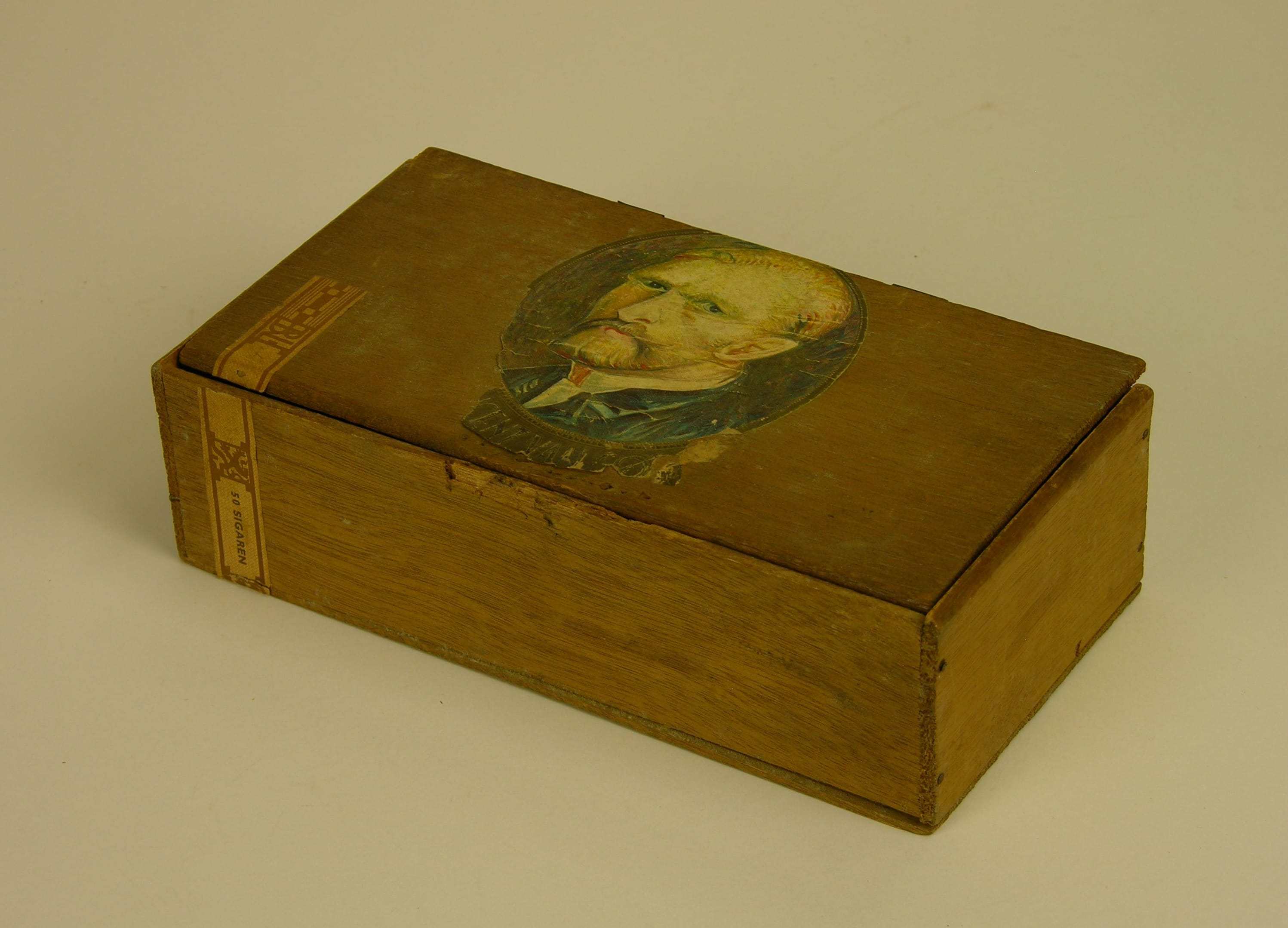 Sigarenkistje 'Vincent van Gogh' - 2e t/m 3e kwart van de 20e eeuw, materiaal: hout, metaal en papier, afmetingen: 6 x 20,8 x 10,4 cm, op het (losse) deksel een lithografisch portretmedaillon met een portret van Vincent van Gogh, accijnszegel: '50 sigaren prijs f 6.50', deksel uit de scharniertjes
