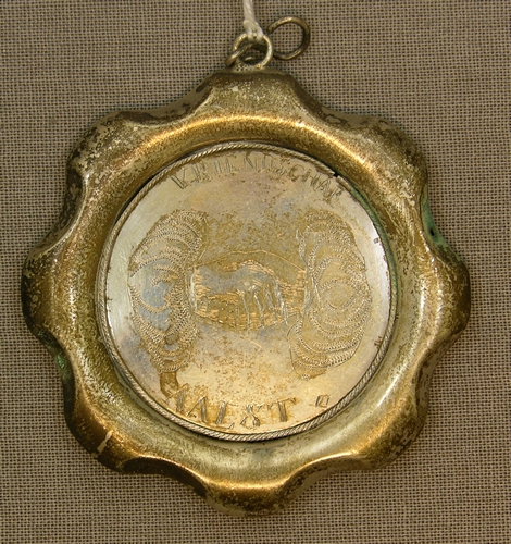 Ronde prijspenning handboogschutterij, materiaal: zilver, recto: inschrift 'Vriendschap Aalst' met ingegraveerde afbeelding van twee in elkaar grijpende handen met mouwuiteinden, verso: inschrift '1862'. Met zware gelobde rand en draagringetje, afmetingen 5,7 x 5,3 x 0,6 cm